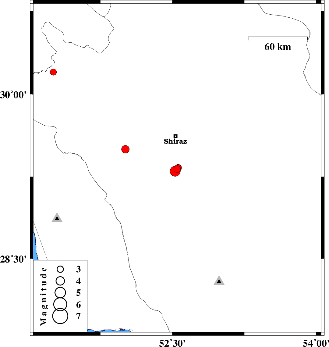 | 2012/10/10 | 17:29:23.5 | 20:59:23.5 | 29.33 | 52.56 | 14 | ML:3.3 | Fars Province, 32 km South of Shiraz | ||