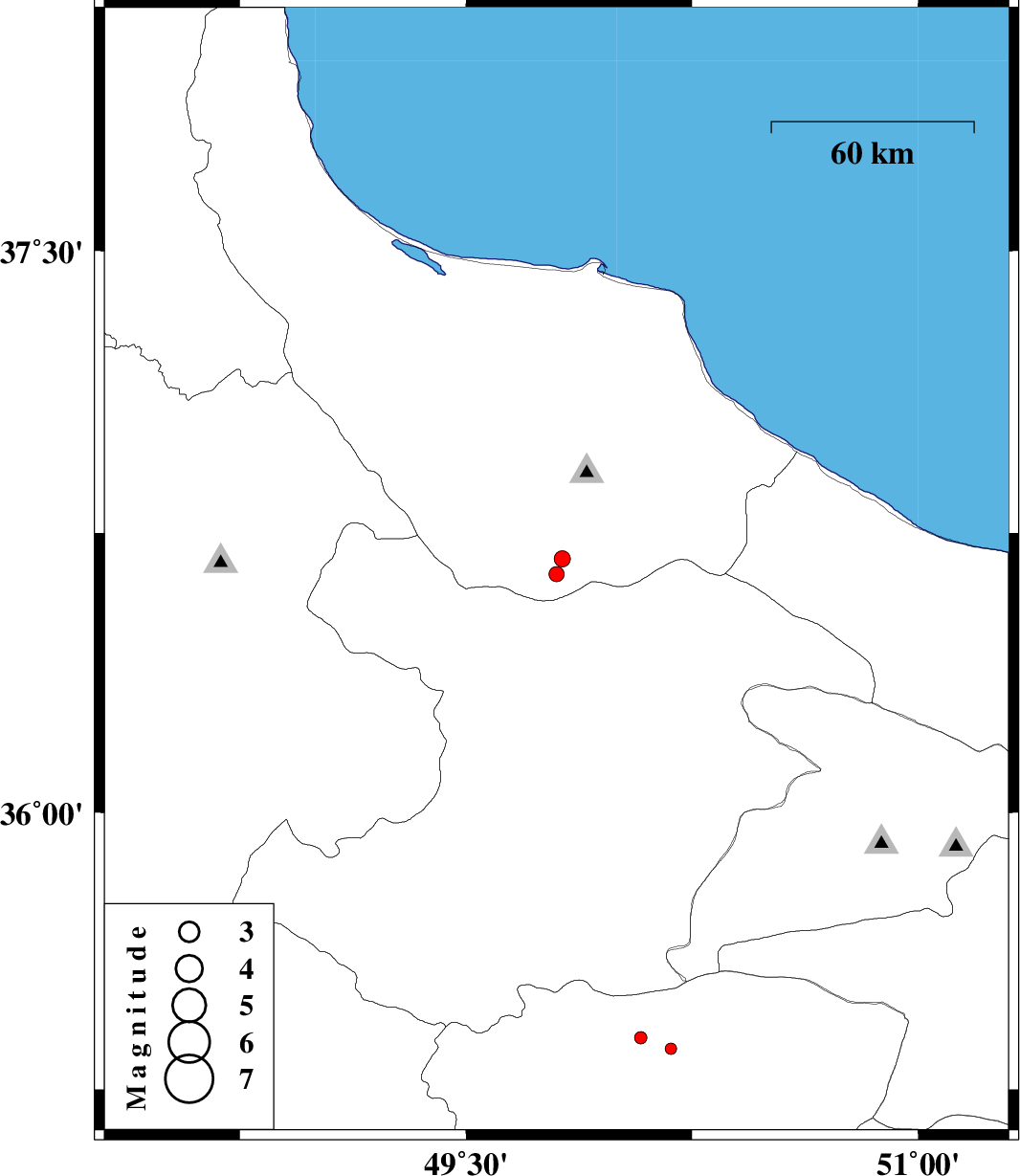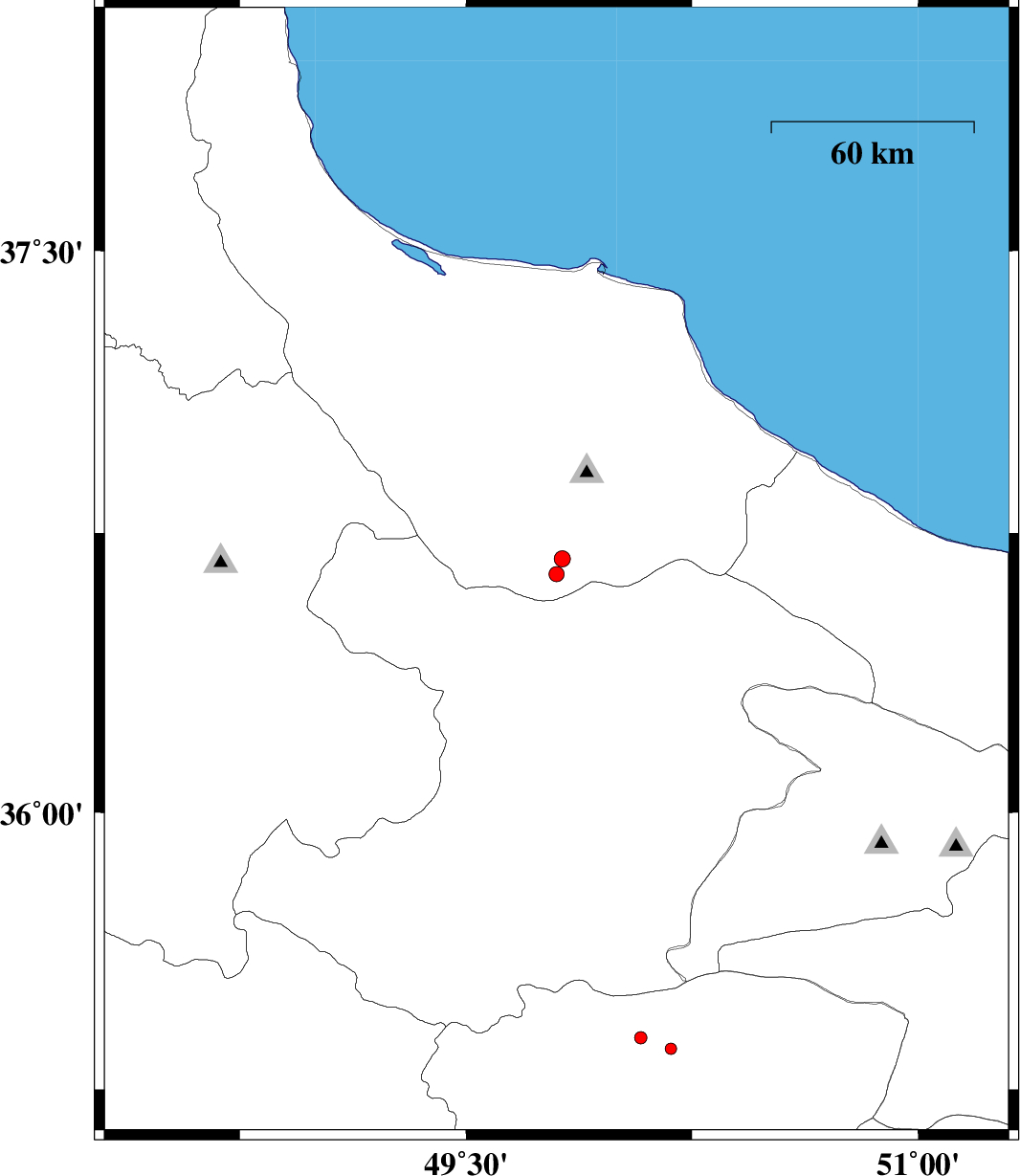 | 2012/09/30 | 04:35:06.1 | 08:05:06.1 | 36.68 | 49.82 | 15 | ML:2.4 | Gilan Province, 52 km South of Siahkal | ||
