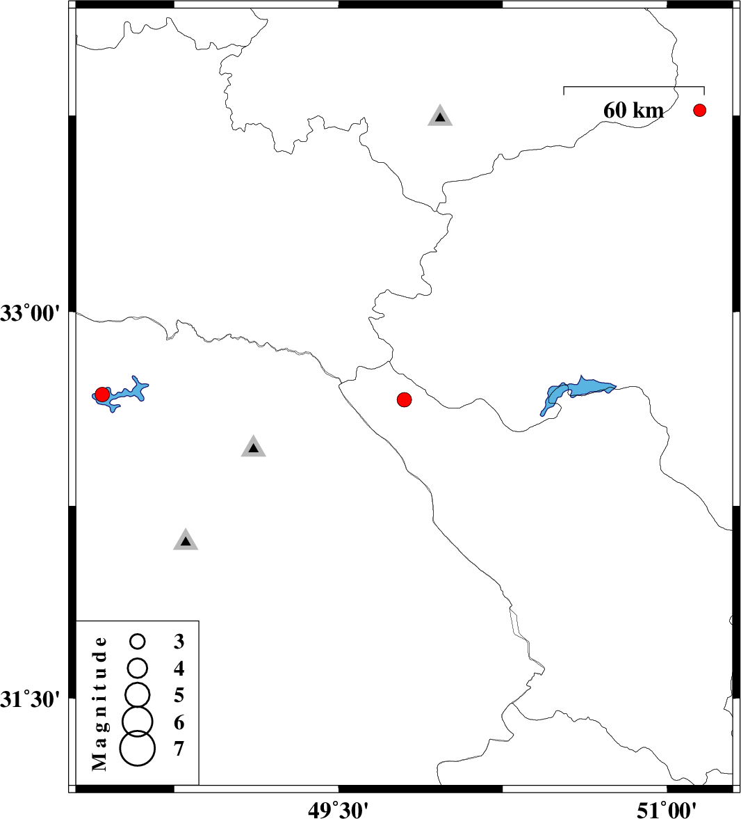| 2012/10/14 | 16:44:02.6 | 20:14:02.6 | 33.77 | 51.15 | 14 | ML:2.6 | Esfahan Province, 37 km South-West of Kashan |