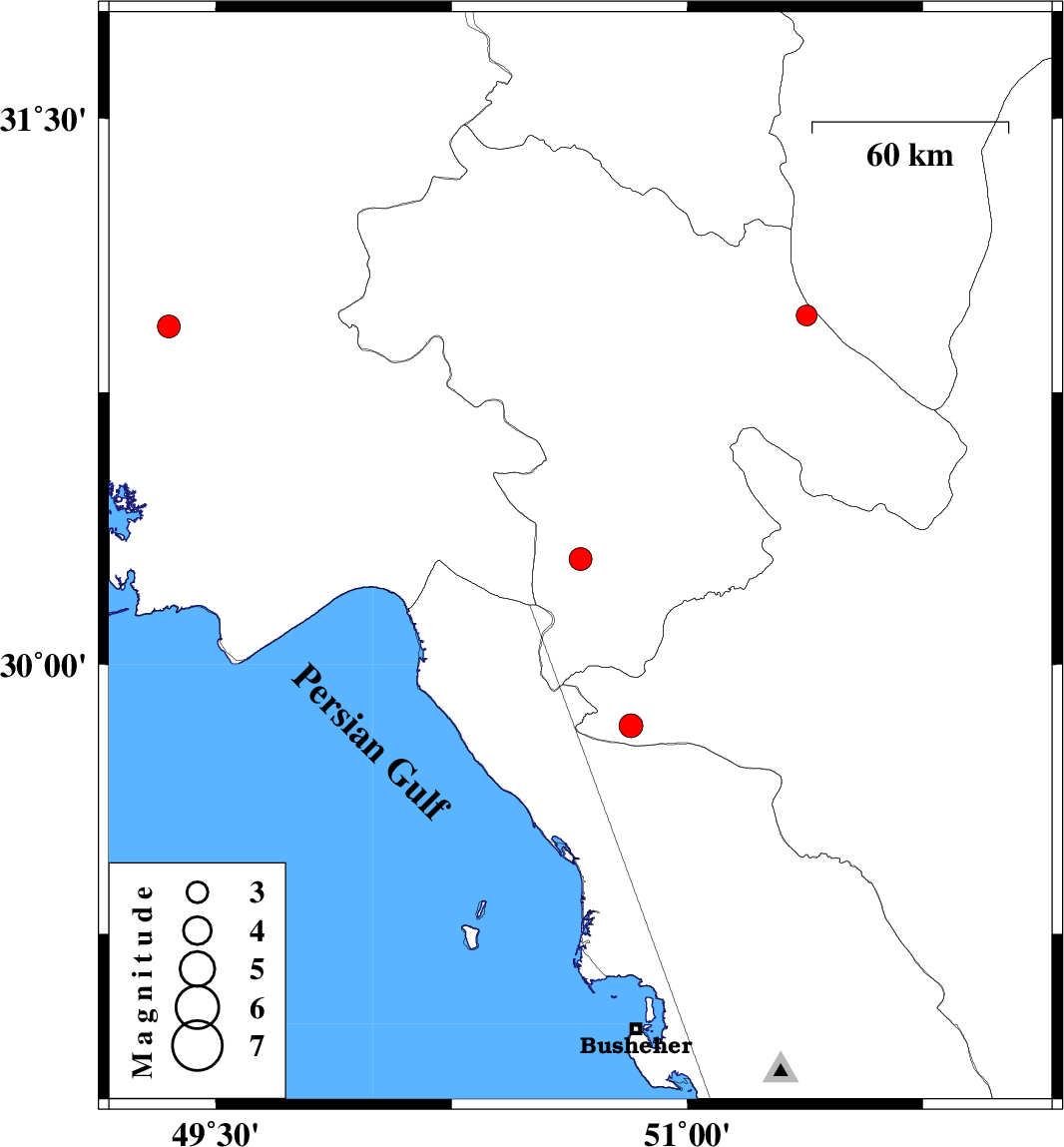 | 2012/10/25 | 07:39:41.4 | 11:09:41.4 | 30.93 | 49.35 | 15 | ML:3.3 | Khoozestan Province, 39 km North-West of Omidiyeh |