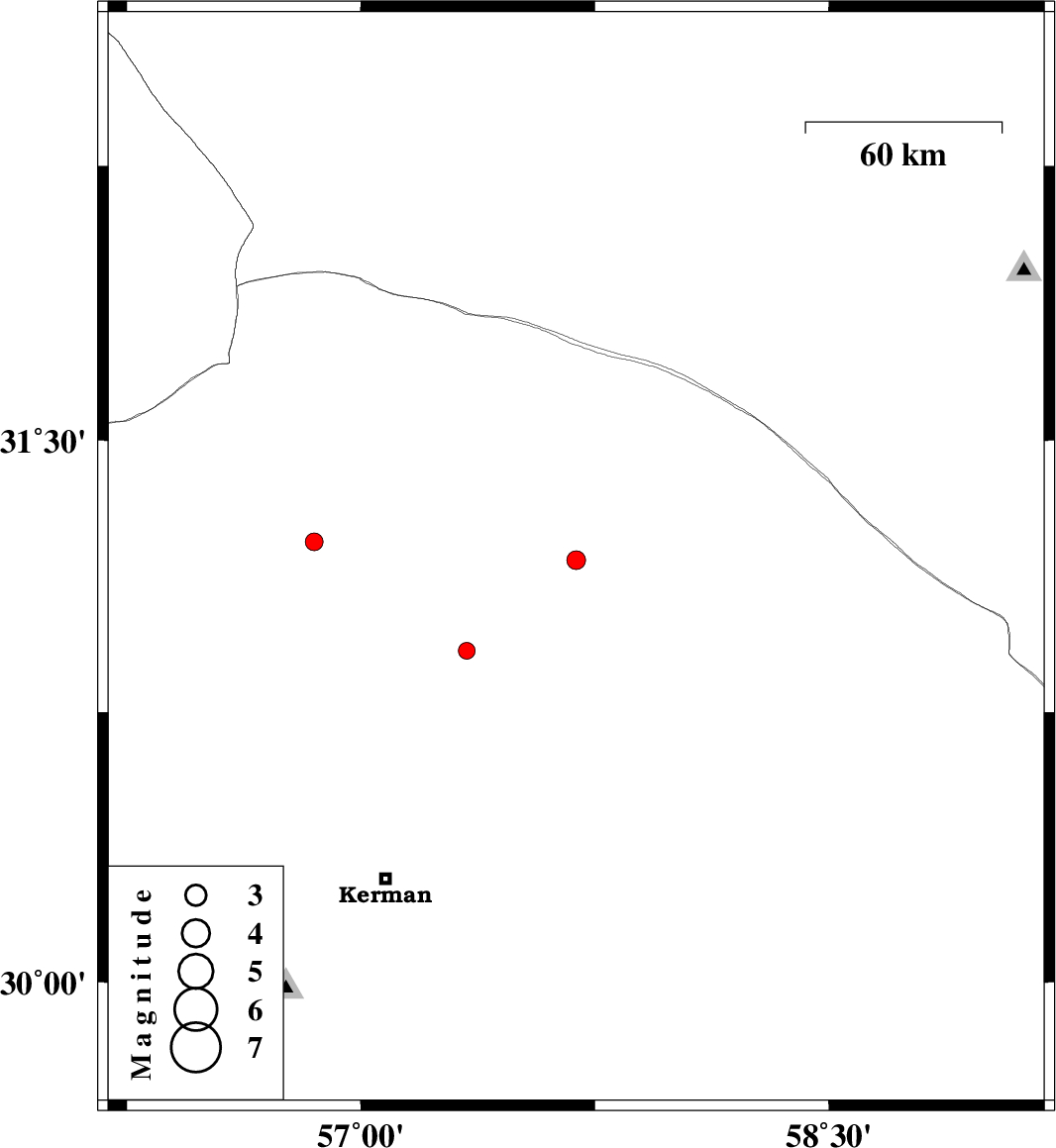 | 2012/11/01 | 12:17:16.9 | 15:47:16.9 | 30.92 | 57.34 | 43 | ML:2.4 | Kerman Province, 63 km South-East of Ravar | ||