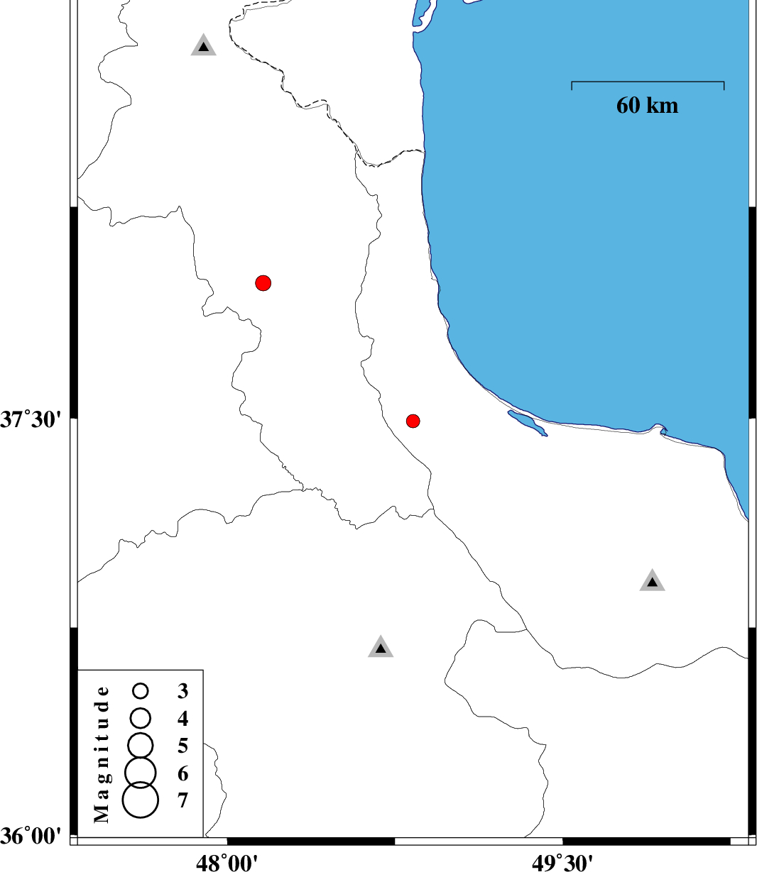 | 2012/11/04 | 05:36:48.1 | 09:06:48.1 | 37.49 | 48.83 | 16 | ML:2.7 | Gilan Province, 29 km West of Rezvanshahr |