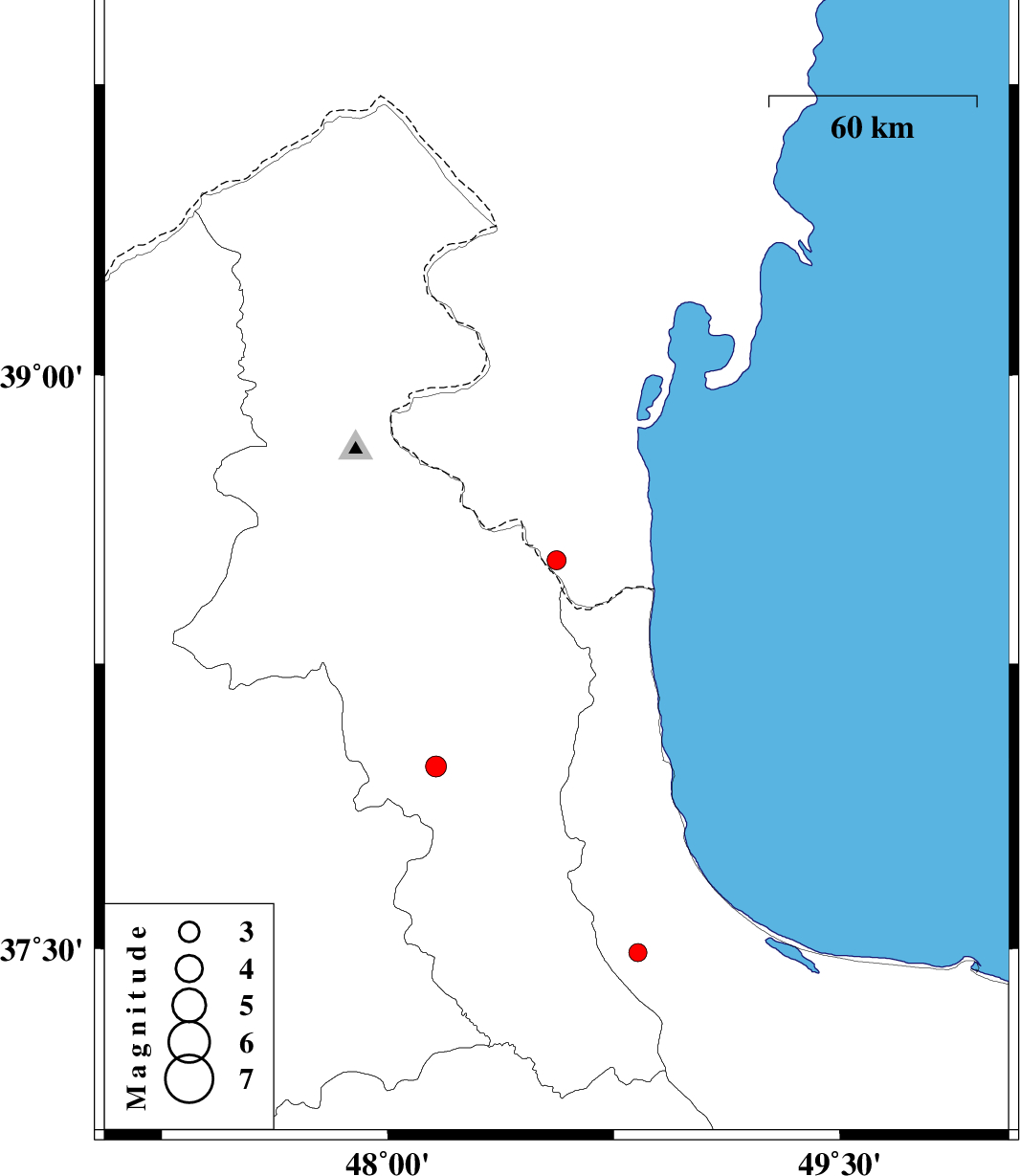 | 2012/11/08 | 02:02:35.2 | 05:32:35.2 | 38.52 | 48.56 | 14 | ML:2.8 | Azerbaijan, 12 km East of Namin | ||