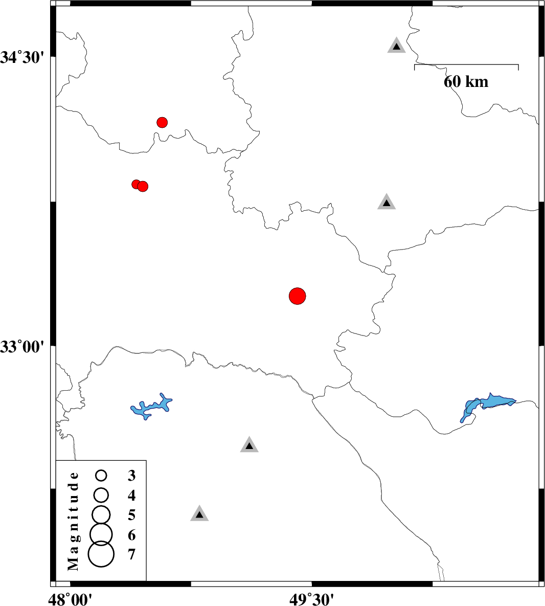 | 2012/11/23 | 01:01:23.6 | 04:31:23.6 | 33.83 | 48.45 | 17 | ML:3 | Lorestan Province, 14 km East of Aleshtar | ||