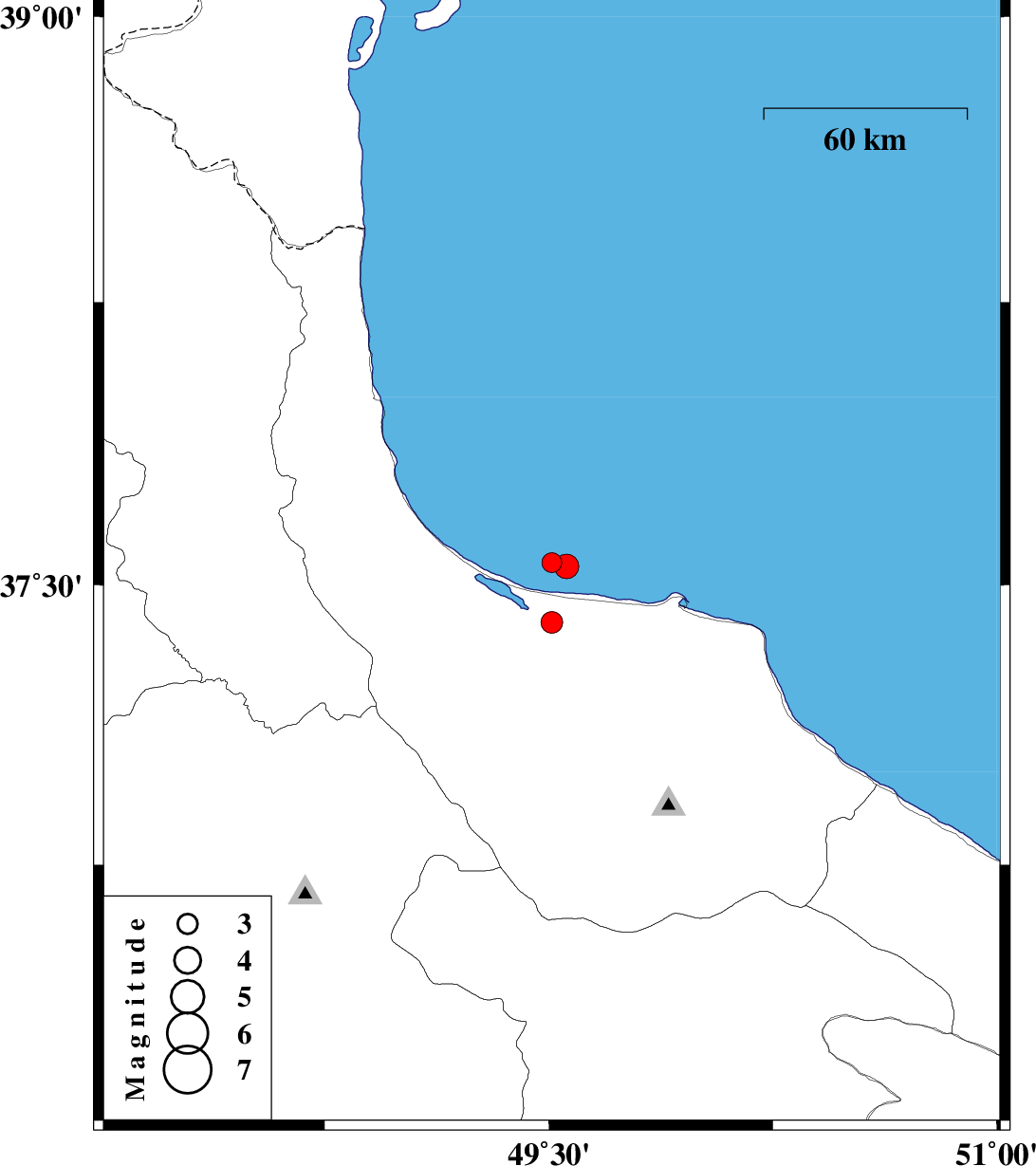 | 2012/12/11 | 09:47:18.7 | 13:17:18.7 | 37.56 | 49.51 | 14 | ML:2.9 | Caspian Sea, 11 km Bandar-e anzali | ||