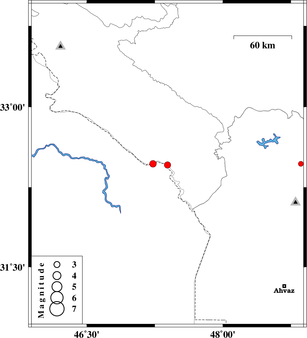 | 2012/12/12 | 02:13:30.5 | 05:43:30.5 | 32.46 | 47.39 | 36 | ML:3.2 | 28 km South-East of Dehloran | ||