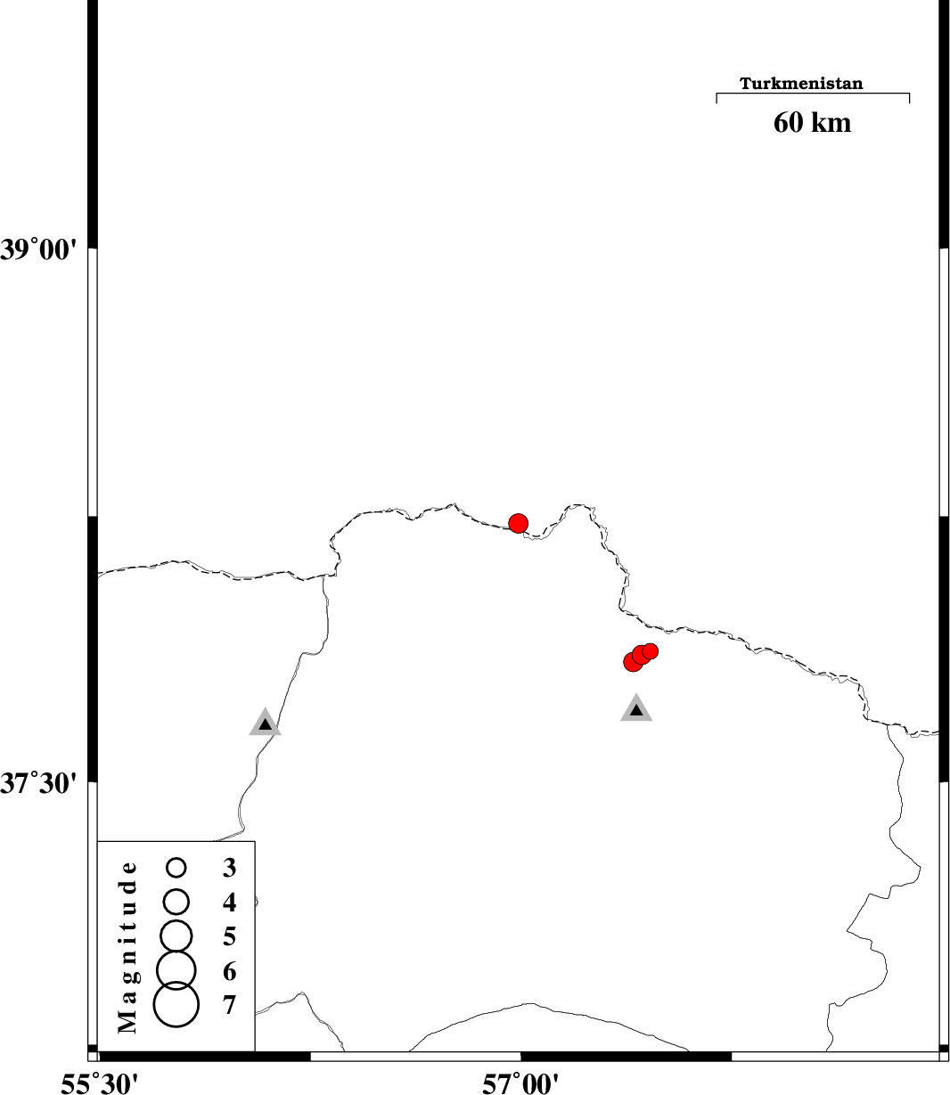 | 2012/12/23 | 21:24:16.1 | 00:54:16.1 | 37.87 | 57.46 | 6 | ML:2.6 | Khorasan(north) Province, 45 km North-East of Bojnurd | ||