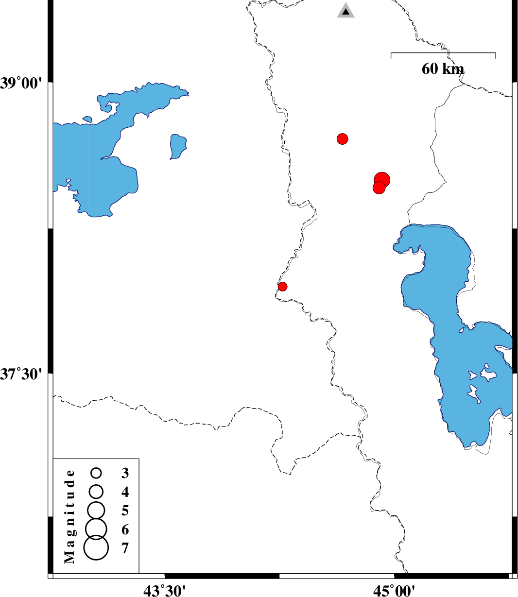 | 2012/11/28 | 00:34:44.3 | 04:04:44.3 | 38.71 | 44.66 | 14 | ML:3.2 | Azarbaijan Gharbi Province, 30 km North-West of Khoy |