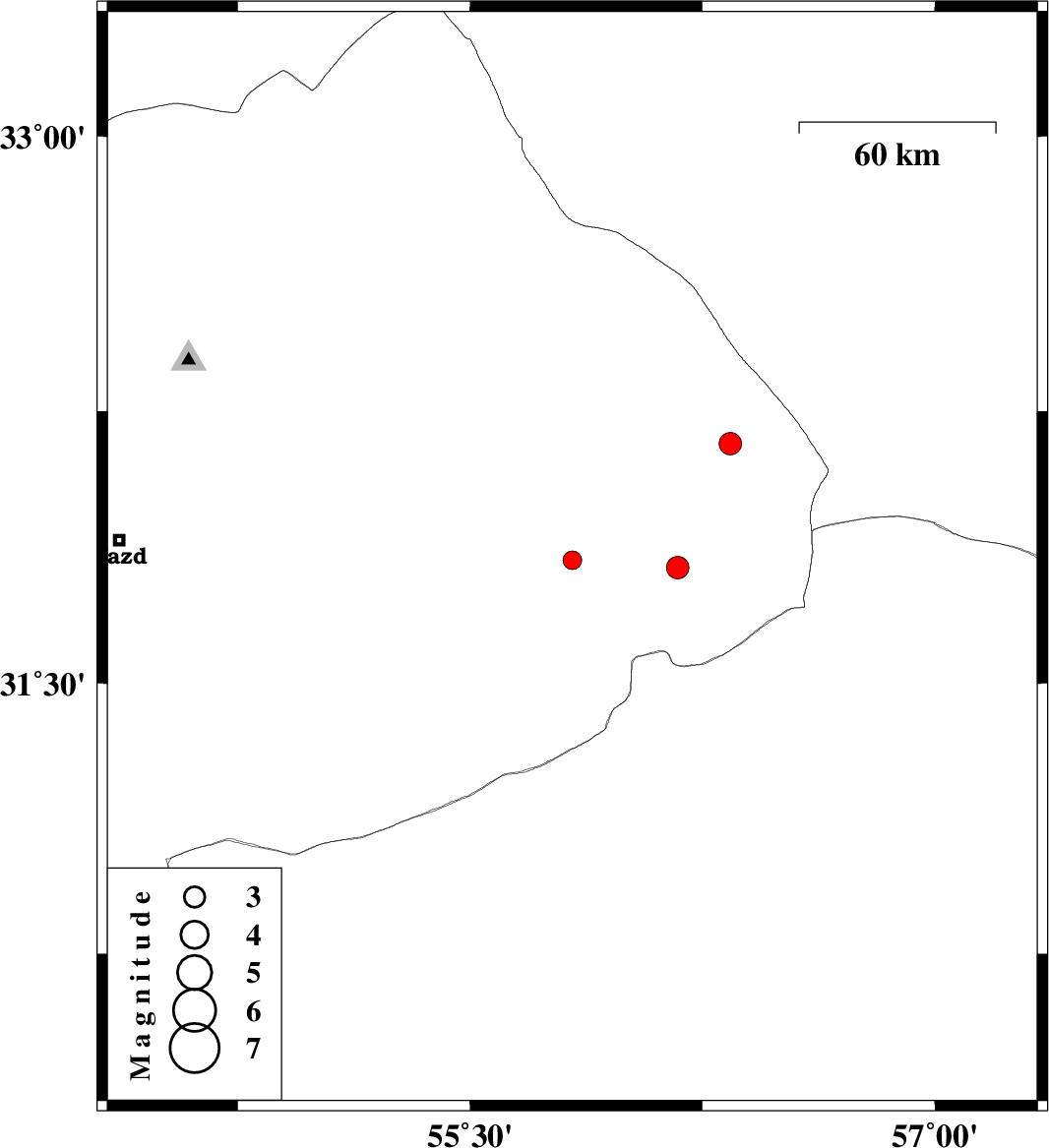 | 2012/12/28 | 19:45:36.4 | 23:15:36.4 | 32.16 | 56.34 | 18 | ML:3.2 | Yazd Province, 109 km North-West of Ravar |