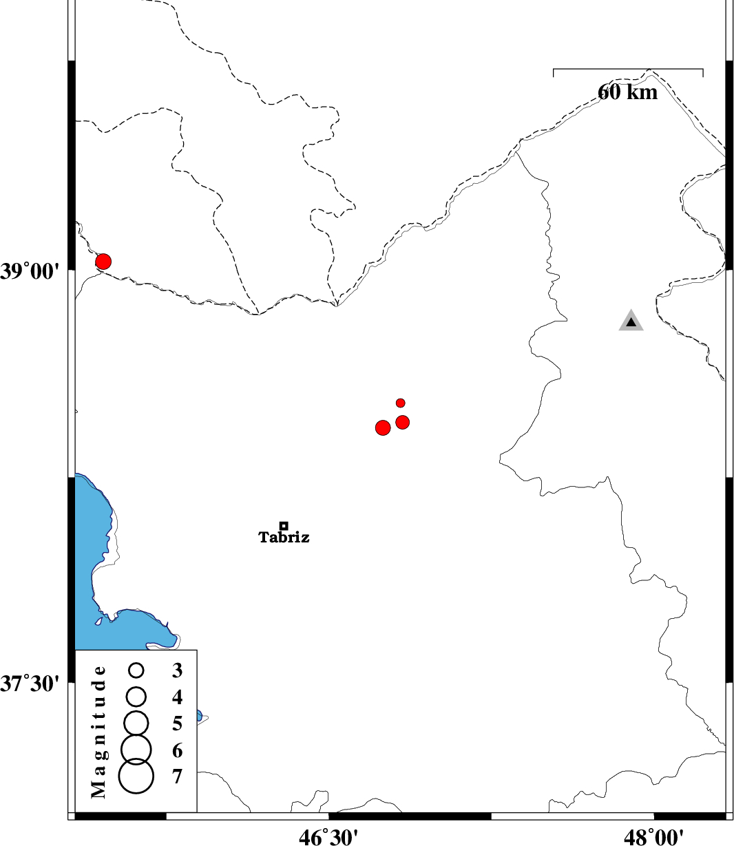 | 2013/01/05 | 00:39:37.3 | 04:09:37.3 | 38.52 | 46.83 | 14 | ML:1.9 | Azarbaijan Sharghi Province, 23 km West of Ahar | ||