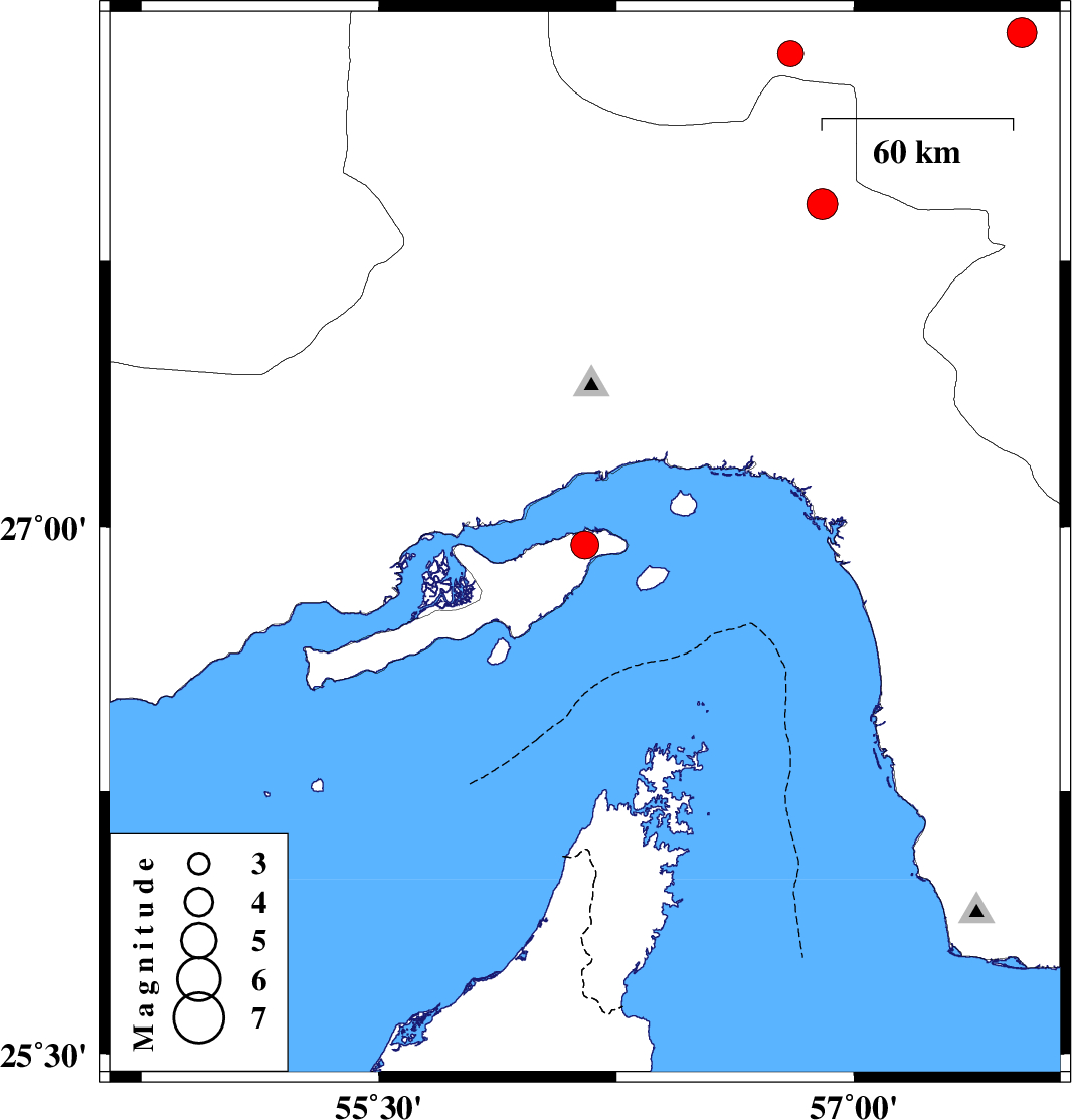 | 2013/01/07 | 00:41:58.1 | 04:11:58.1 | 26.95 | 56.15 | 14 | ML:4 | Persian Gulf, 11 km West of Qeshm | ||