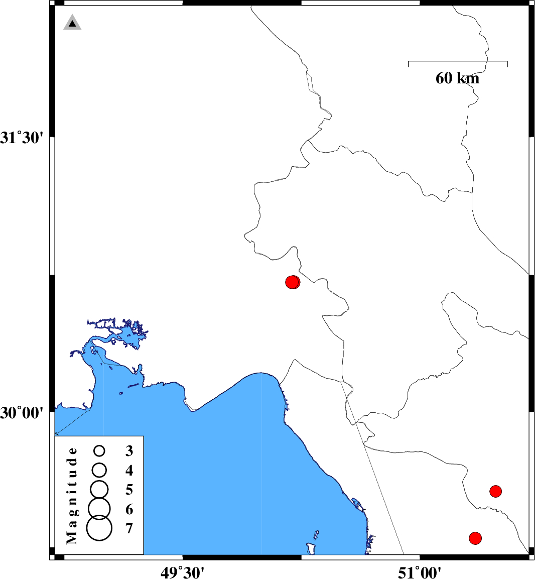| 2013/01/03 | 18:25:18.5 | 21:55:18.5 | 30.71 | 50.2 | 32 | ML:3.8 | Khoozestan Province, 14 km North of Behbahan | ||