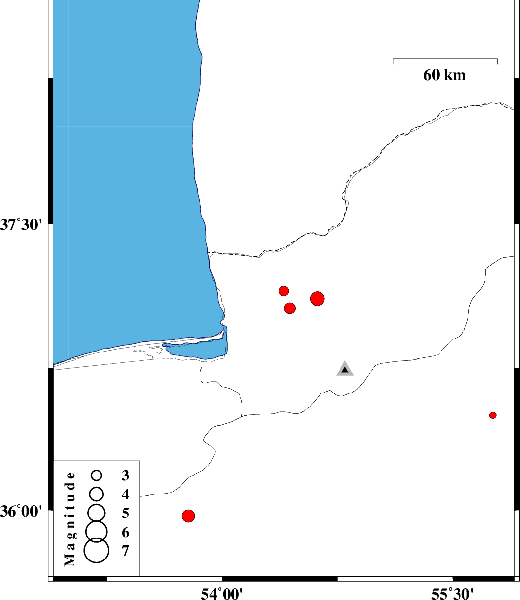 | 2013/01/08 | 01:01:09.6 | 04:31:09.6 | 37.15 | 54.4 | 14 | ML:3 | Golestan Province, 16 km North of Aq Qaleh | ||
