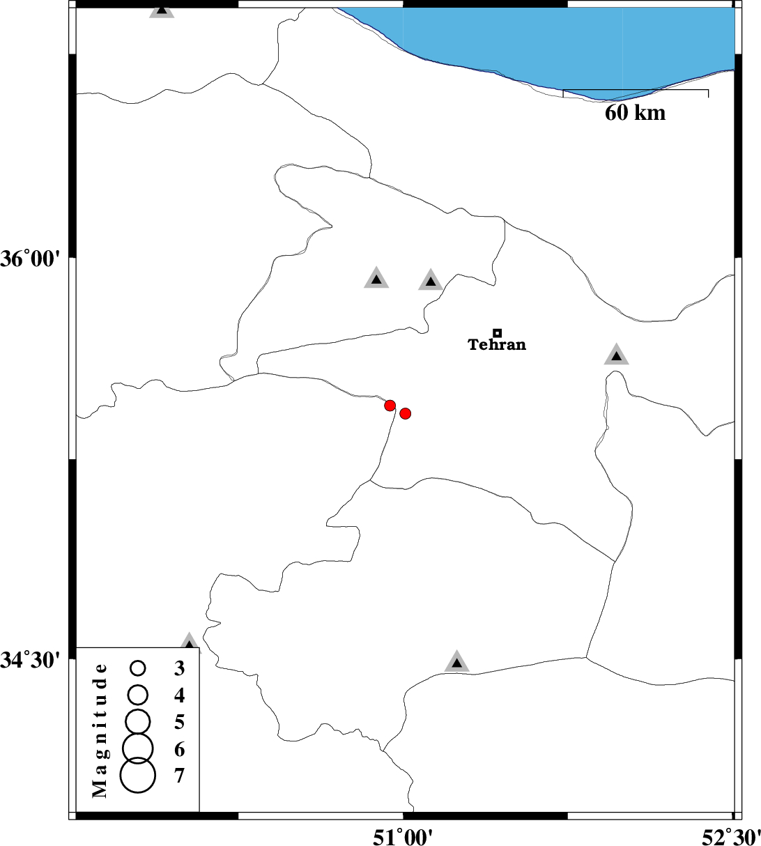 | 2013/01/15 | 07:51:35.5 | 11:21:35.5 | 35.42 | 51.01 | 23 | ML:2.3 | Tehran Province, 9 km Robatkarim | ||
