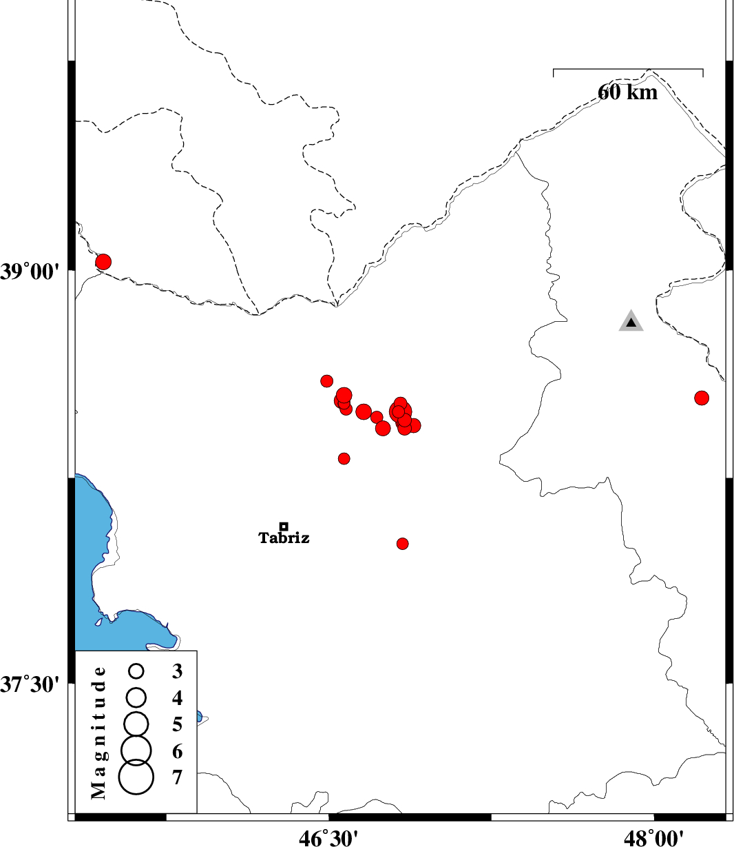 2013/01/25 03:06:22.4 06:36:22.4 38.5546.5715 ML:3.2 Azarbaijan Sharghi Province, 45 km West of Ahar