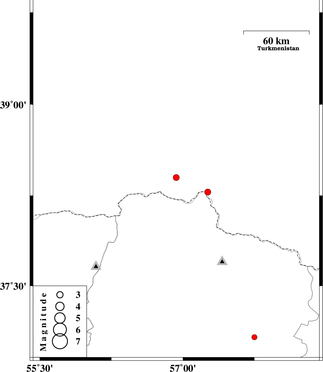 | 2013/01/23 | 17:58:30.4 | 21:28:30.4 | 38.28 | 57.26 | 14 | ML:2.9 | Turkmenistan, 90 km North of Bojnurd |