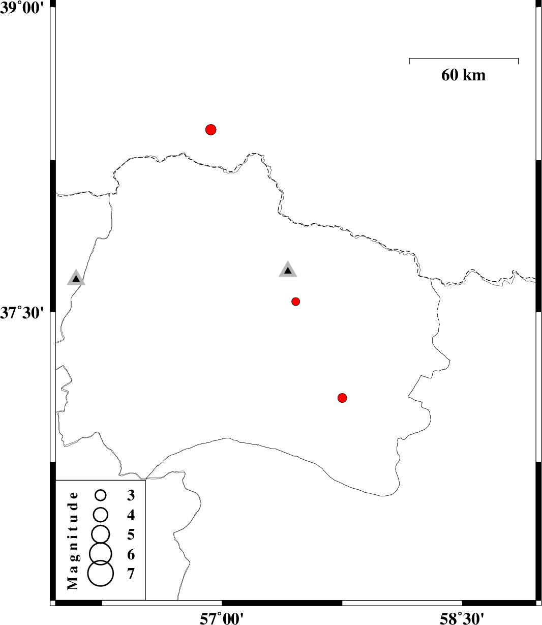 | 2013/01/26 | 13:22:31.4 | 16:52:31.4 | 37.07 | 57.75 | 46 | ML:2.5 | Khorasan(north) Province, 23 km East of Esfarayen |