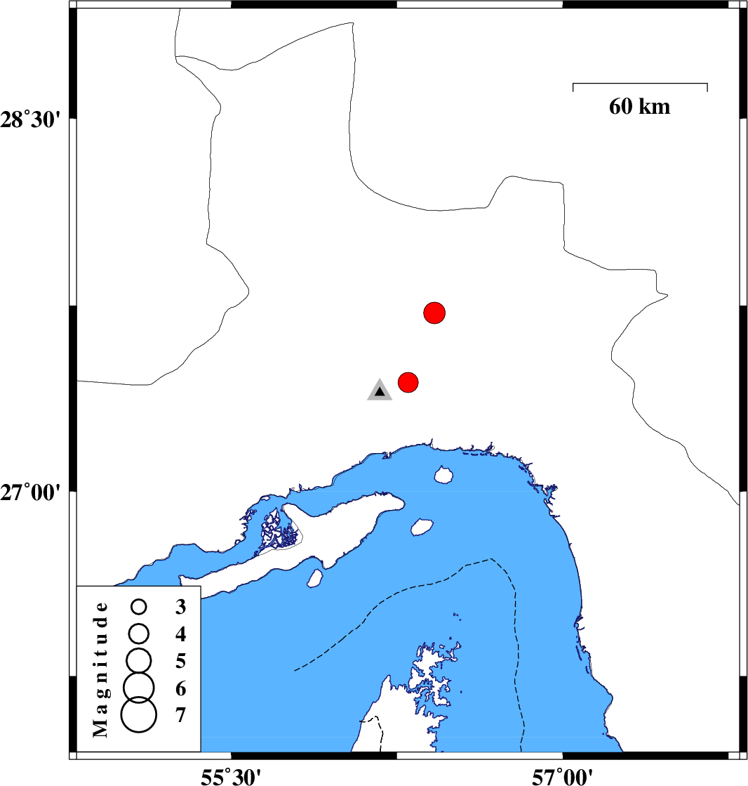 | 2013/02/07 | 13:42:09.1 | 17:12:09.1 | 27.44 | 56.3 | 15 | ML:4.1 | Hormozgan Province, 29 km North of Bandar-e abbas | ||