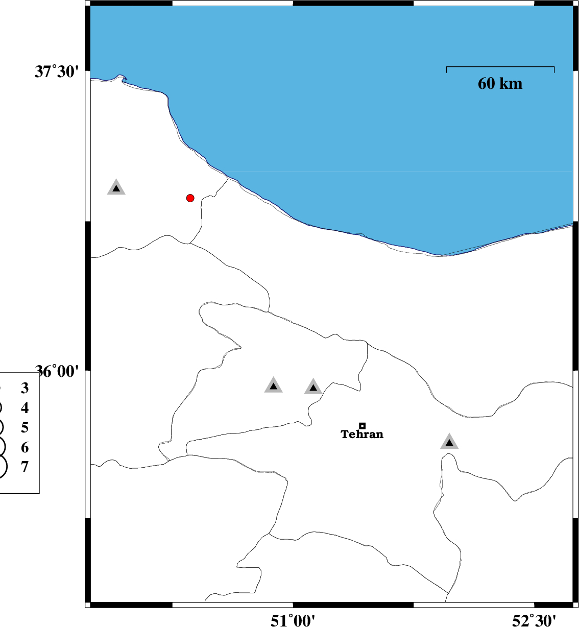 | 2013/02/11 | 06:43:09.8 | 10:13:09.8 | 36.32 | 51.24 | 10 | ML:2.1 | Mazandaran Province, 40 km South-West of Chalus | ||