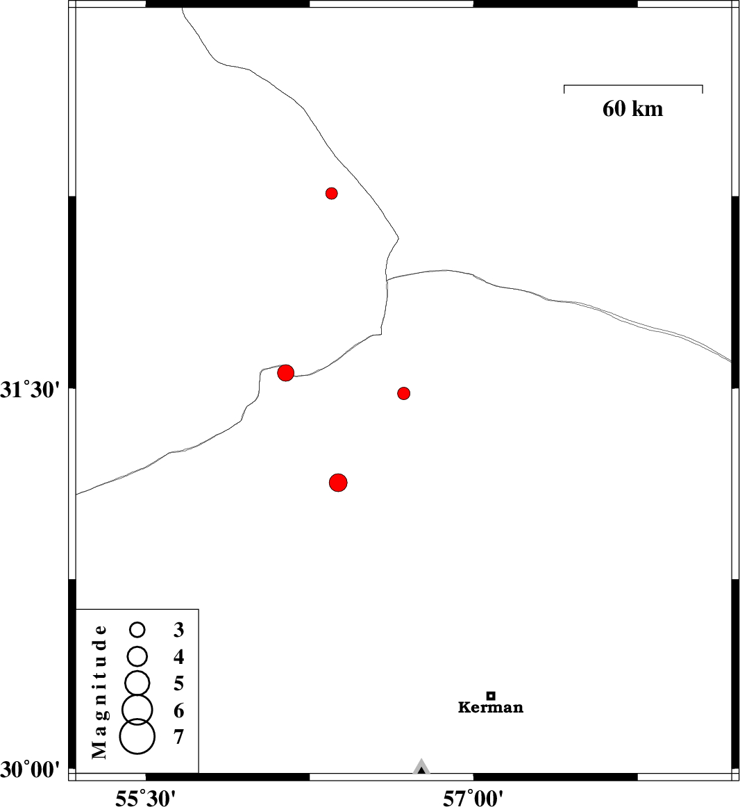 | 2013/02/18 | 00:56:09.4 | 04:26:09.4 | 31.48 | 56.68 | 35 | ML:2.6 | Kerman Province, 27 km North-West of Ravar | ||