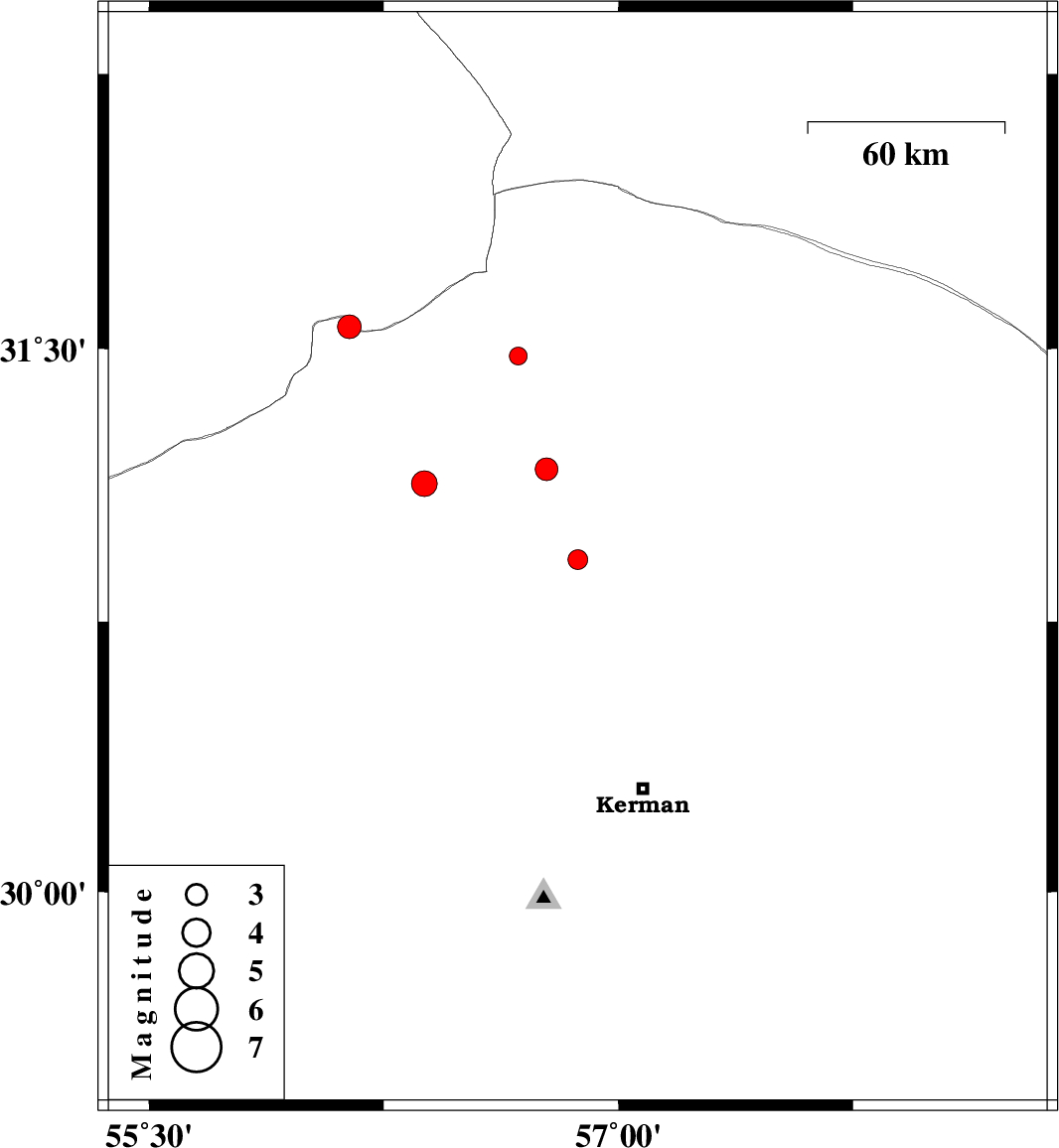 | 2013/02/19 | 00:03:50.5 | 03:33:50.5 | 30.92 | 56.87 | 14 | ML:2.8 | Kerman Province, 39 km South of Ravar | ||