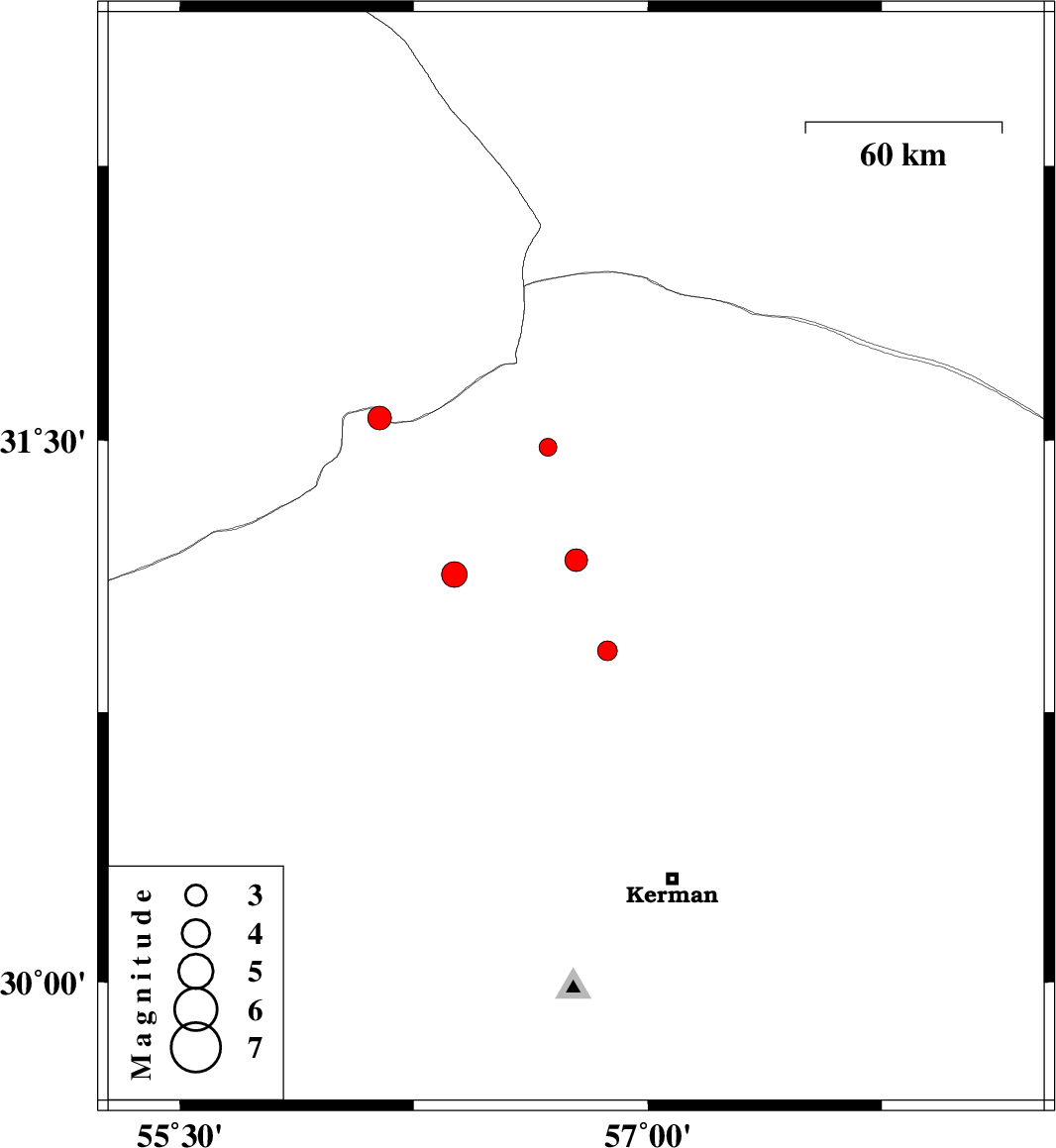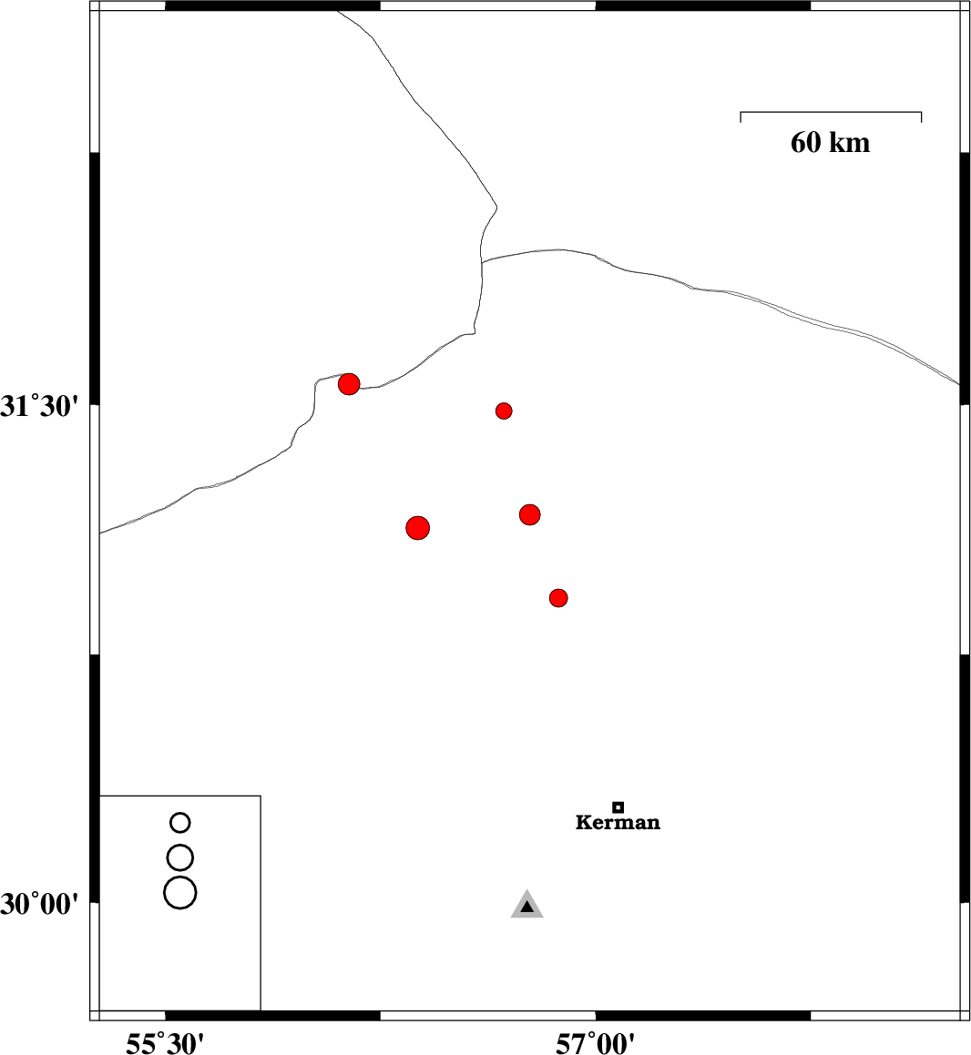 | 2013/02/19 | 20:12:50.7 | 23:42:50.7 | 31.17 | 56.77 | 14 | ML:3.2 | Kerman Province, 12 km Ravar | ||