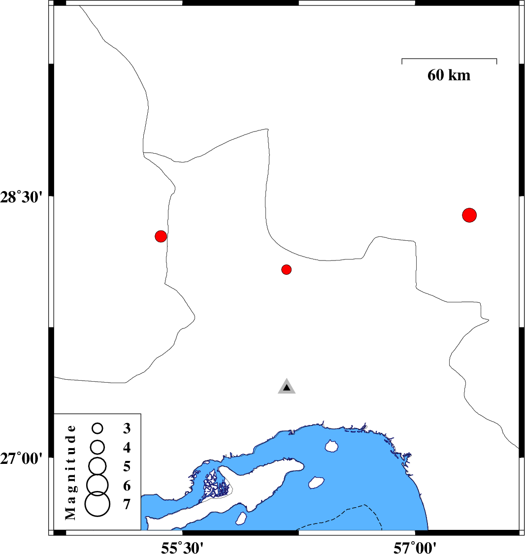 | 2013/02/21 | 02:08:25.6 | 05:38:25.6 | 28.08 | 56.17 | 17 | ML:2.8 | Hormozgan Province, 37 km South-East of Hajiabad | ||