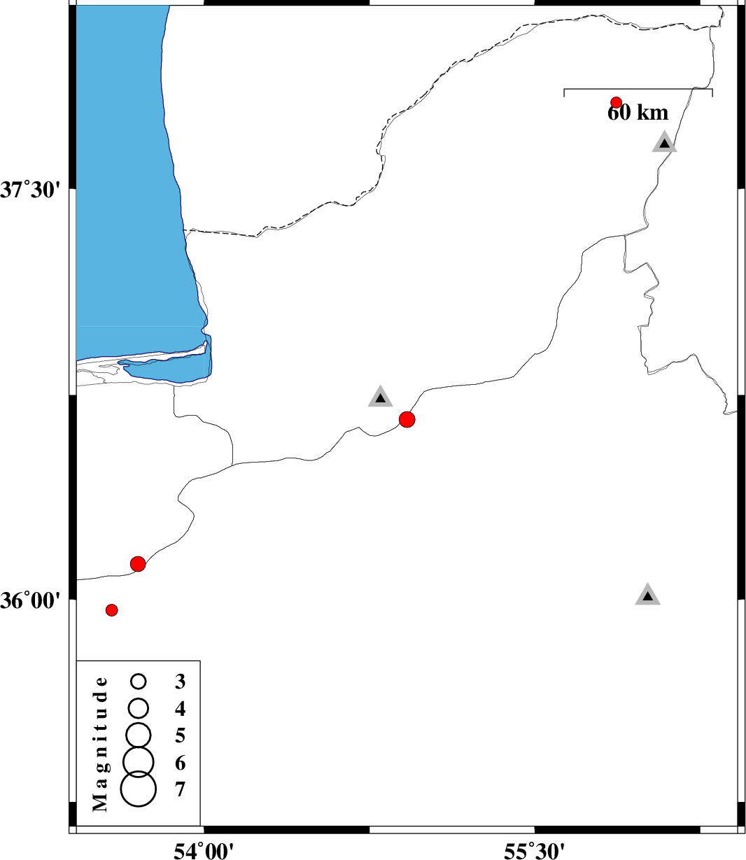 | 2013/02/11 | 22:58:55.6 | 02:28:55.6 | 37.81 | 55.87 | 14 | ML:2.3 | Golestan Province, 58 km North-East of Kalaleh |