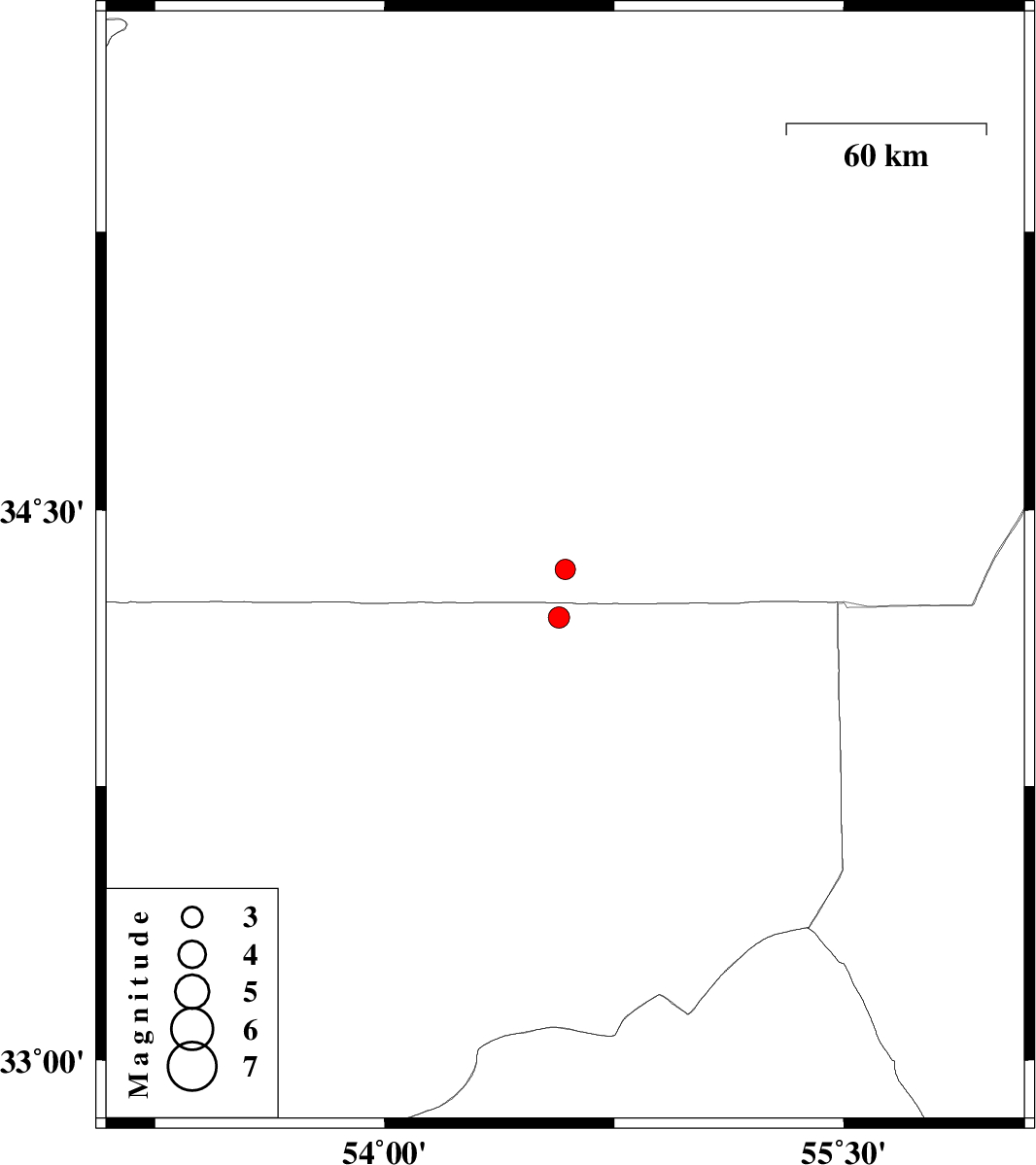 | 2013/03/15 | 11:17:51.3 | 14:47:51.3 | 34.21 | 54.57 | 14 | ML:3.1 | Esfahan Province, 219 km South-East of Damghan |