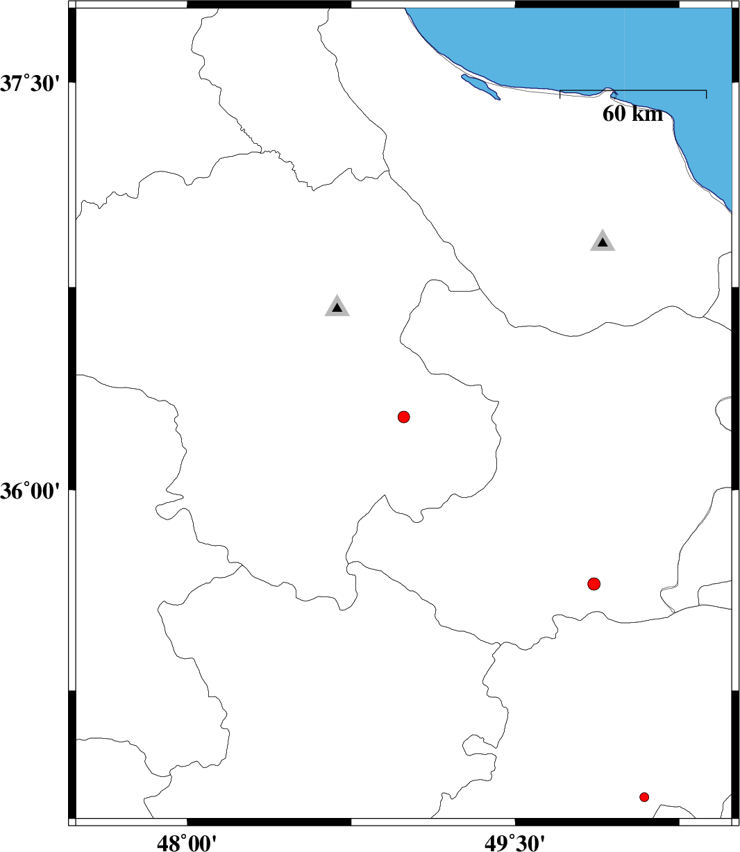| 2013/03/19 | 01:50:39.3 | 05:20:39.3 | 36.27 | 48.99 | 14 | ML:2.4 | Zanjan Province, 19 km West of Khoramdareh | ||