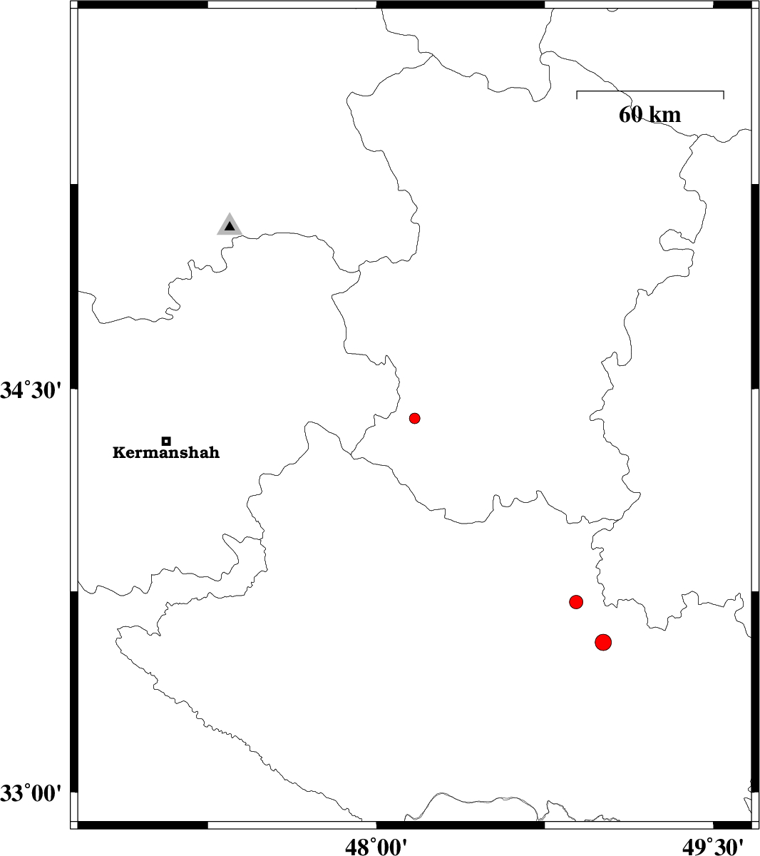 | 2013/03/15 | 08:34:40.1 | 12:04:40.1 | 33.71 | 48.89 | 15 | ML:2.7 | Lorestan Province, 24 km South-East of Borujerd |