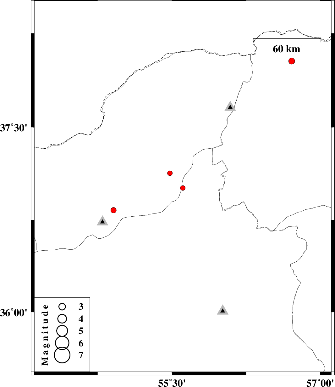 | 2013/03/23 | 07:32:37.6 | 12:02:37.6 | 38.03 | 56.71 | 14 | ML:2.8 | Khorasan(north) Province, 57 km North-West of Ashkhaneh |