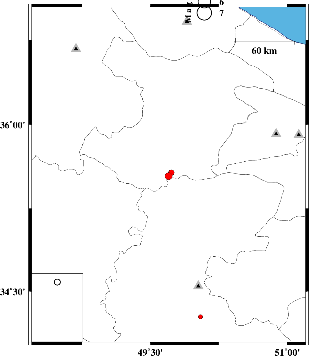 | 2013/04/02 | 16:10:41.2 | 20:40:41.2 | 35.57 | 49.73 | 15 | ML:2.8 | Ghazvin Province, 55 km South of Takestan |