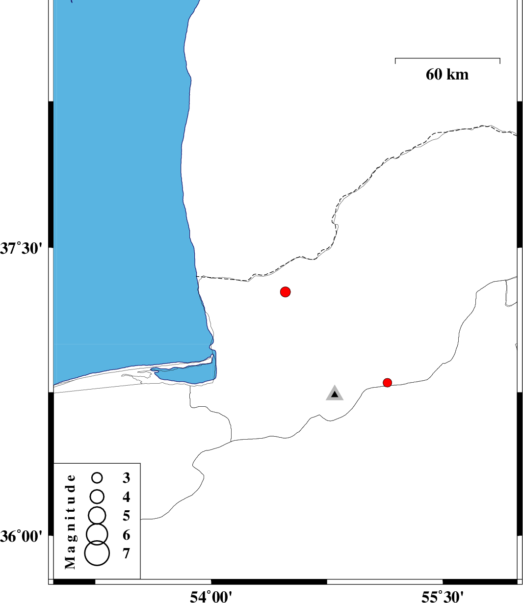 | 2013/04/09 | 10:22:49.3 | 14:52:49.3 | 37.27 | 54.48 | 14 | ML:2.9 | Golestan Province, 29 km North of Aq Qaleh | ||