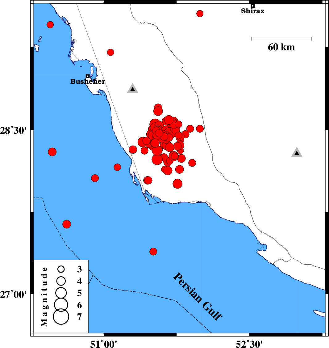2013/04/09 15:26:10.8 19:56:10.8 28.4651.8436 ML:3.5 Bushehr Province, 50 km South-East of Khormog