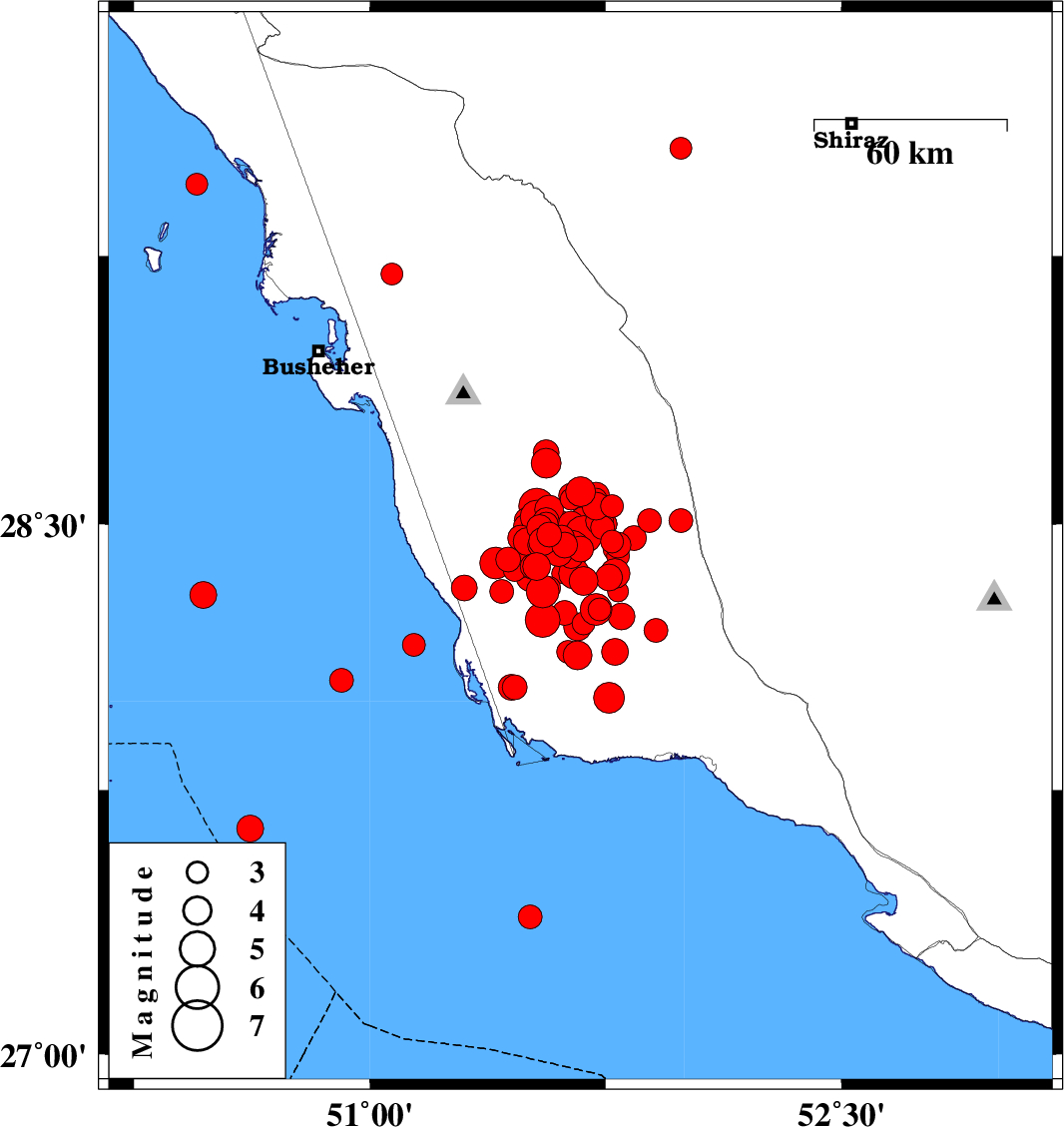2013/04/10 19:41:57.5 00:11:57.5 28.4551.5530 ML:3.9 Bushehr Province, 28 km South-East of Khormog