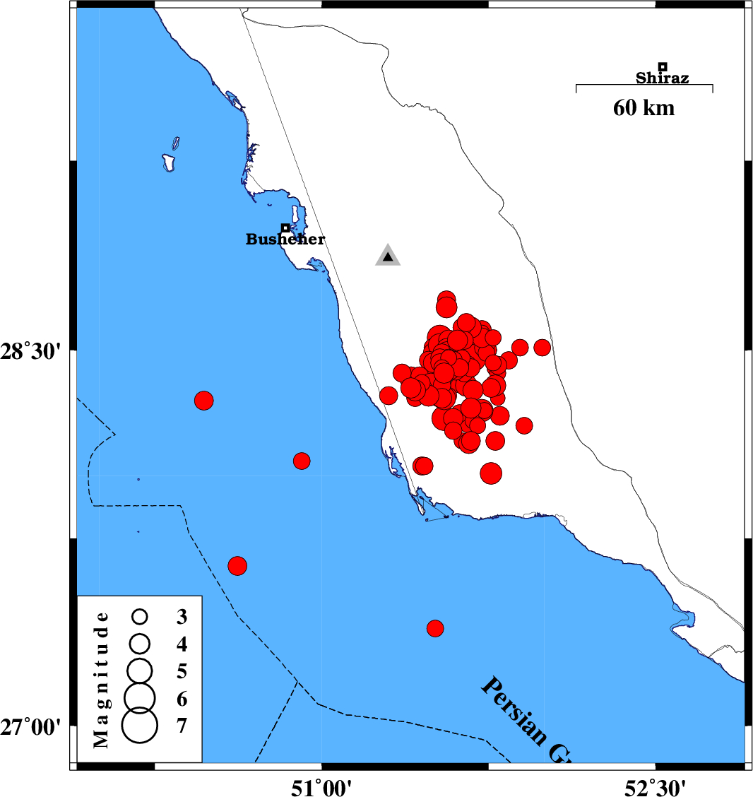 2013/04/10 19:41:57.5 00:11:57.5 28.4551.5530 ML:3.9 Bushehr Province, 28 km South-East of Khormog