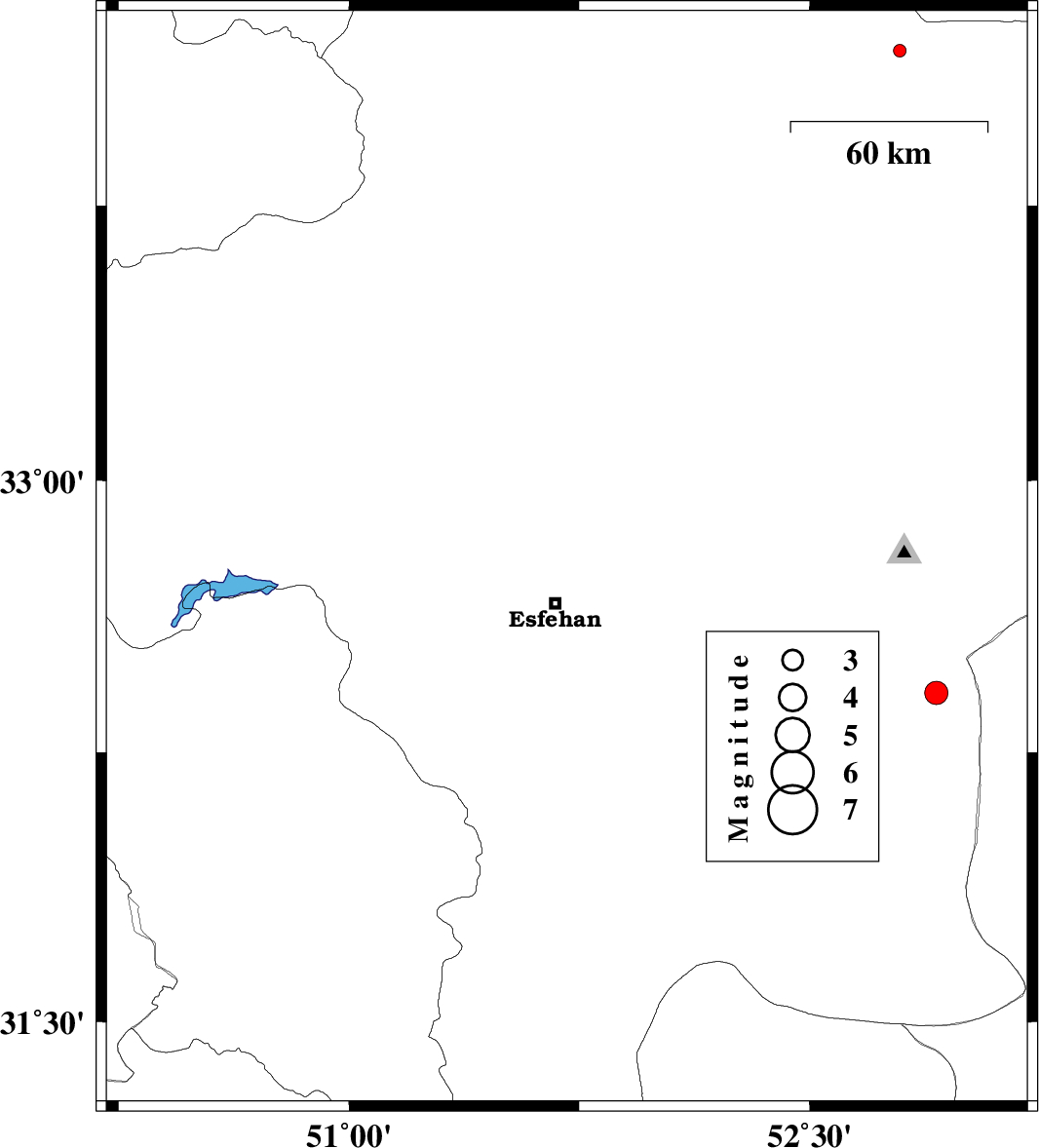 | 2013/04/19 | 20:22:34.6 | 00:52:34.6 | 32.78 | 51.71 | 14 | ML:4 | Esfahan Province, 13 km North of Esfahan | ||