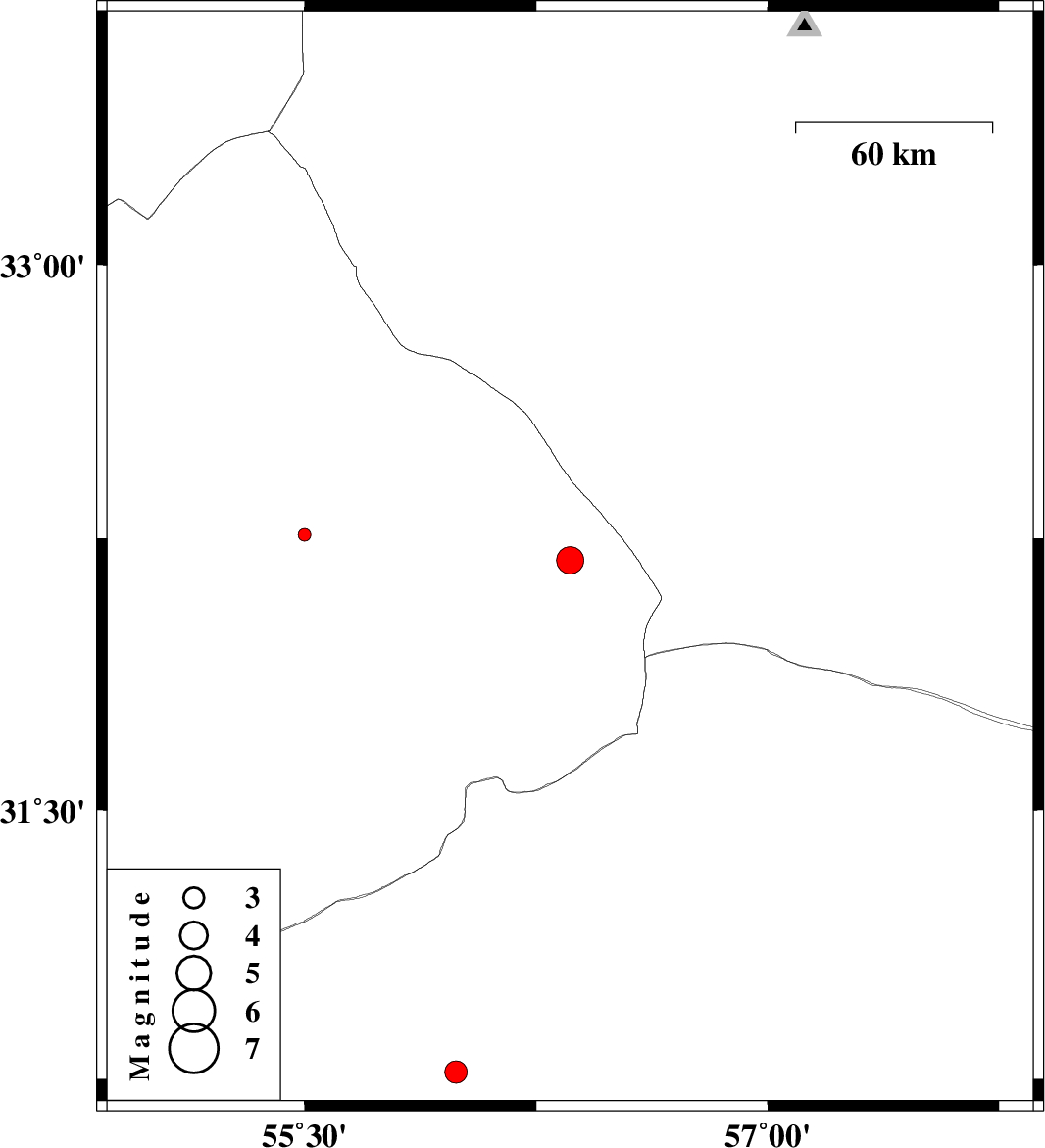| 2013/04/17 | 18:36:20.3 | 23:06:20.3 | 30.77 | 55.99 | 18 | ML:3.3 | Kerman Province, 41 km North of Rafsanjan |