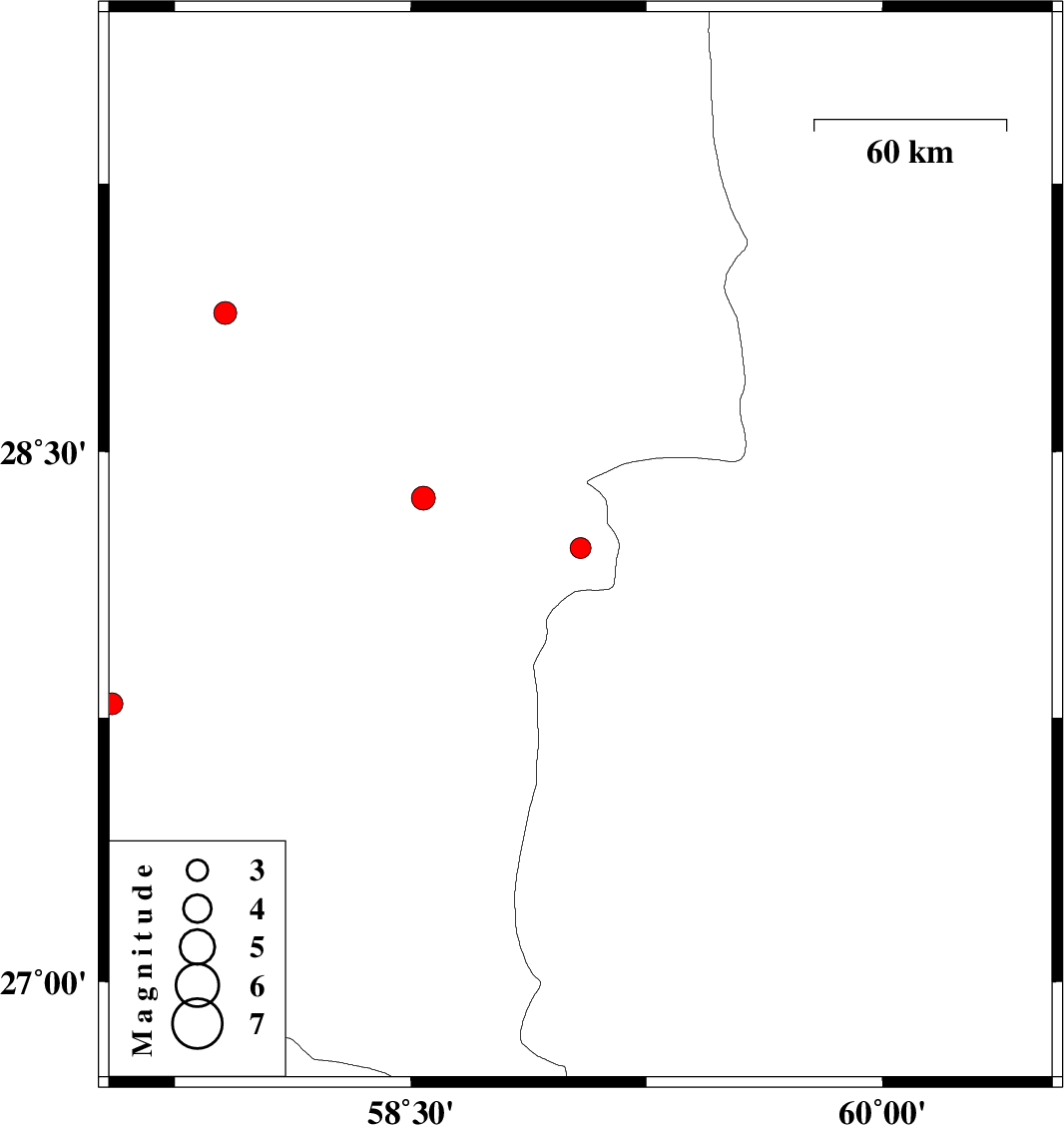 | 2013/04/30 | 01:44:07.3 | 06:14:07.3 | 28.23 | 59.04 | 14 | ML:3 | Kerman Province, 119 km South-East of Bam | ||