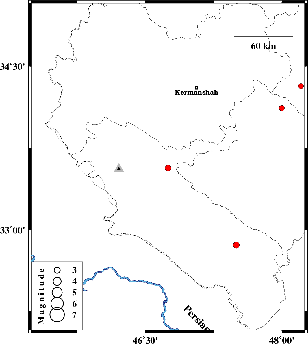 | 2013/05/03 | 08:57:36.6 | 13:27:36.6 | 33.57 | 46.75 | 14 | ML:3 | Ilam Province, 30 km East of Ilam | ||