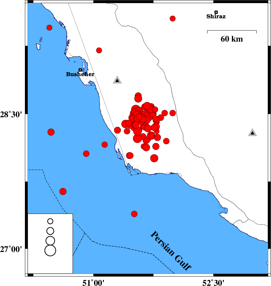 2013/04/10 19:41:57.5 00:11:57.5 28.4551.5530 ML:3.9 Bushehr Province, 28 km South-East of Khormog