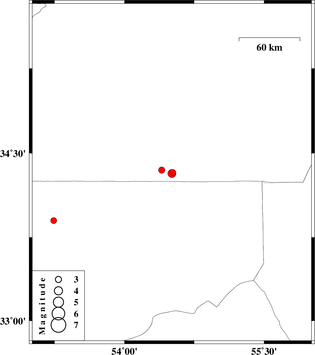 | 2013/05/07 | 20:23:00.3 | 00:53:00.3 | 34.32 | 54.51 | 14 | ML:4 | Semnan Province, 206 km South-East of Damghan | ||