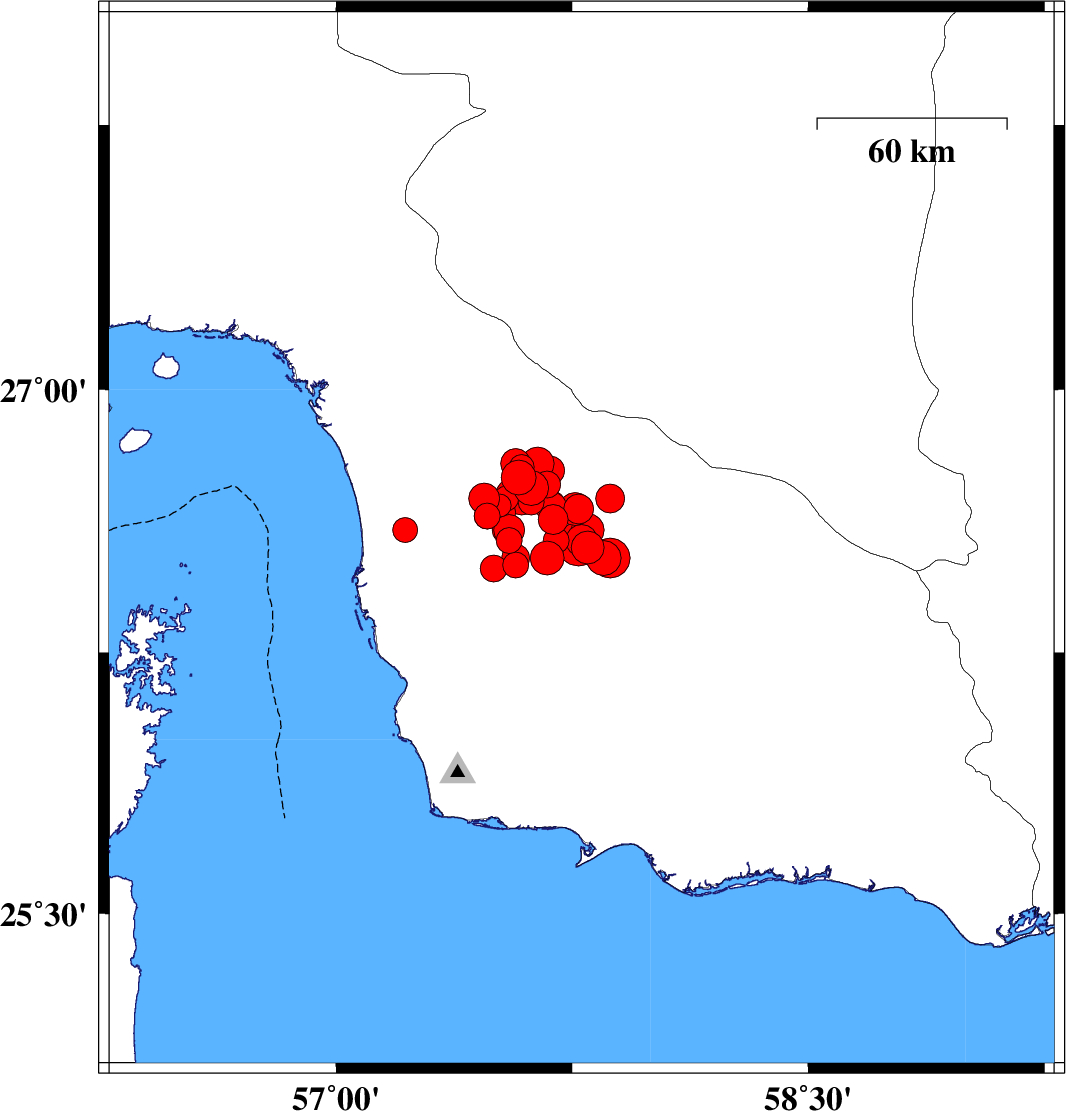2013/05/11 22:23:05.8 02:53:05.8 26.7557.5814 ML:5 Hormozgan Province, 74 km South of Manujan