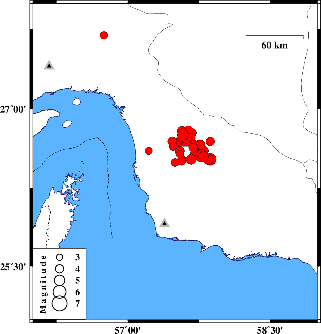 2013/05/11 22:28:08.5 02:58:08.5 26.6957.4714 ML:4.4 Hormozgan Province, 80 km South of Manujan