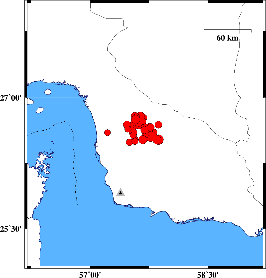 2013/05/11 22:28:08.5 02:58:08.5 26.6957.4714 ML:4.4 Hormozgan Province, 80 km South of Manujan