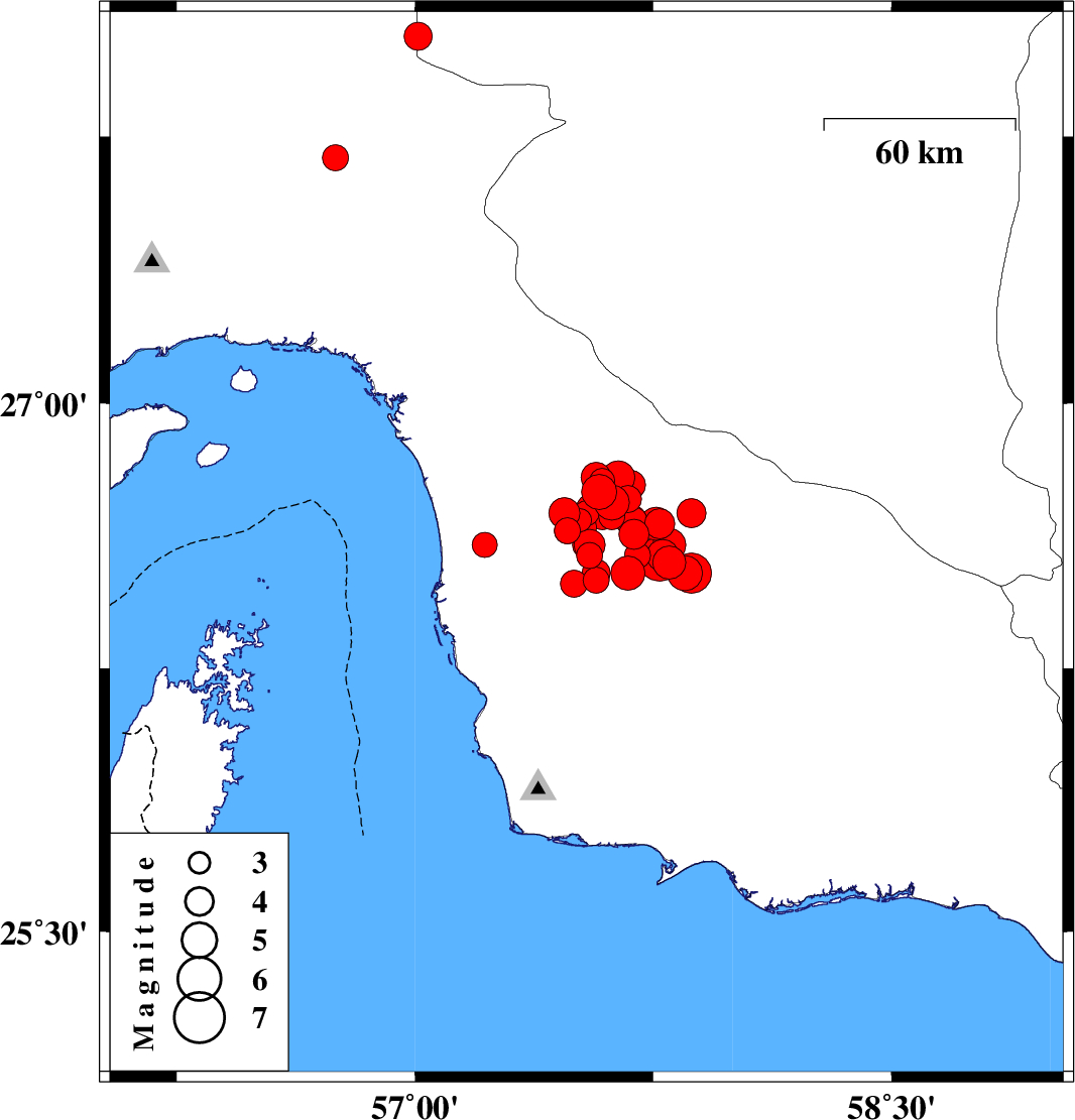 2013/05/11 22:23:05.8 02:53:05.8 26.7557.5814 ML:5 Hormozgan Province, 74 km South of Manujan