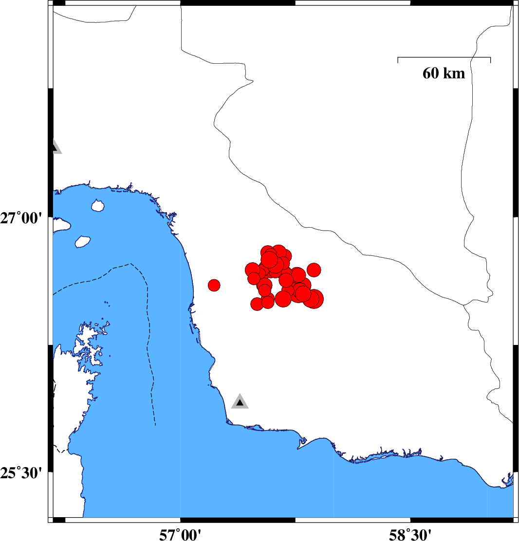 2013/05/11 22:23:05.8 02:53:05.8 26.7557.5814 ML:5 Hormozgan Province, 74 km South of Manujan