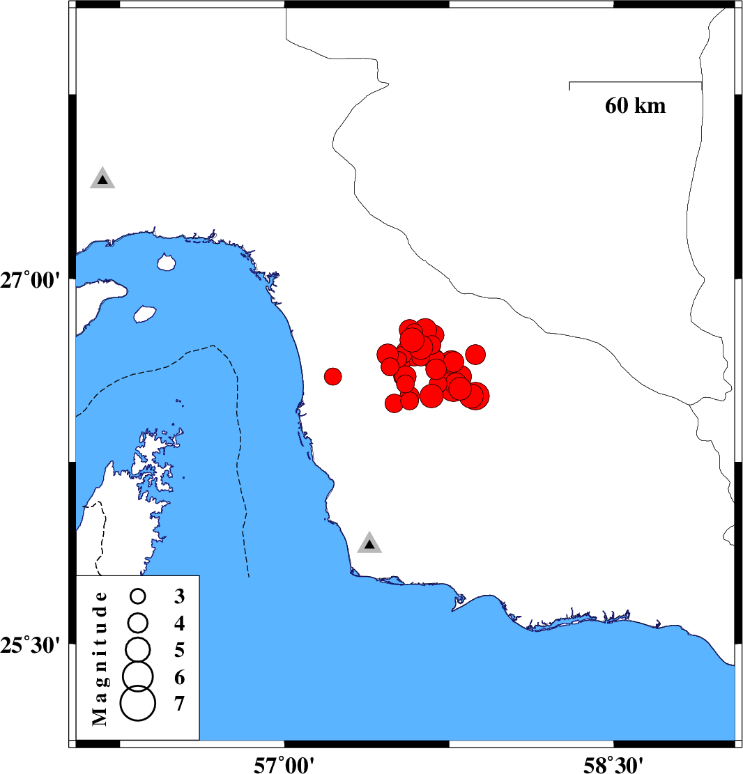 2013/05/11 22:23:05.8 02:53:05.8 26.7557.5814 ML:5 Hormozgan Province, 74 km South of Manujan