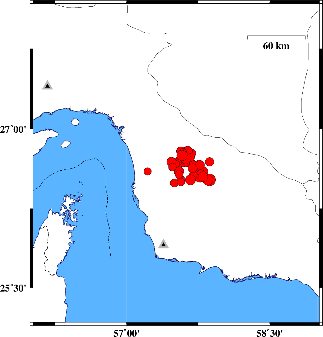 2013/05/11 22:28:08.5 02:58:08.5 26.6957.4714 ML:4.4 Hormozgan Province, 80 km South of Manujan